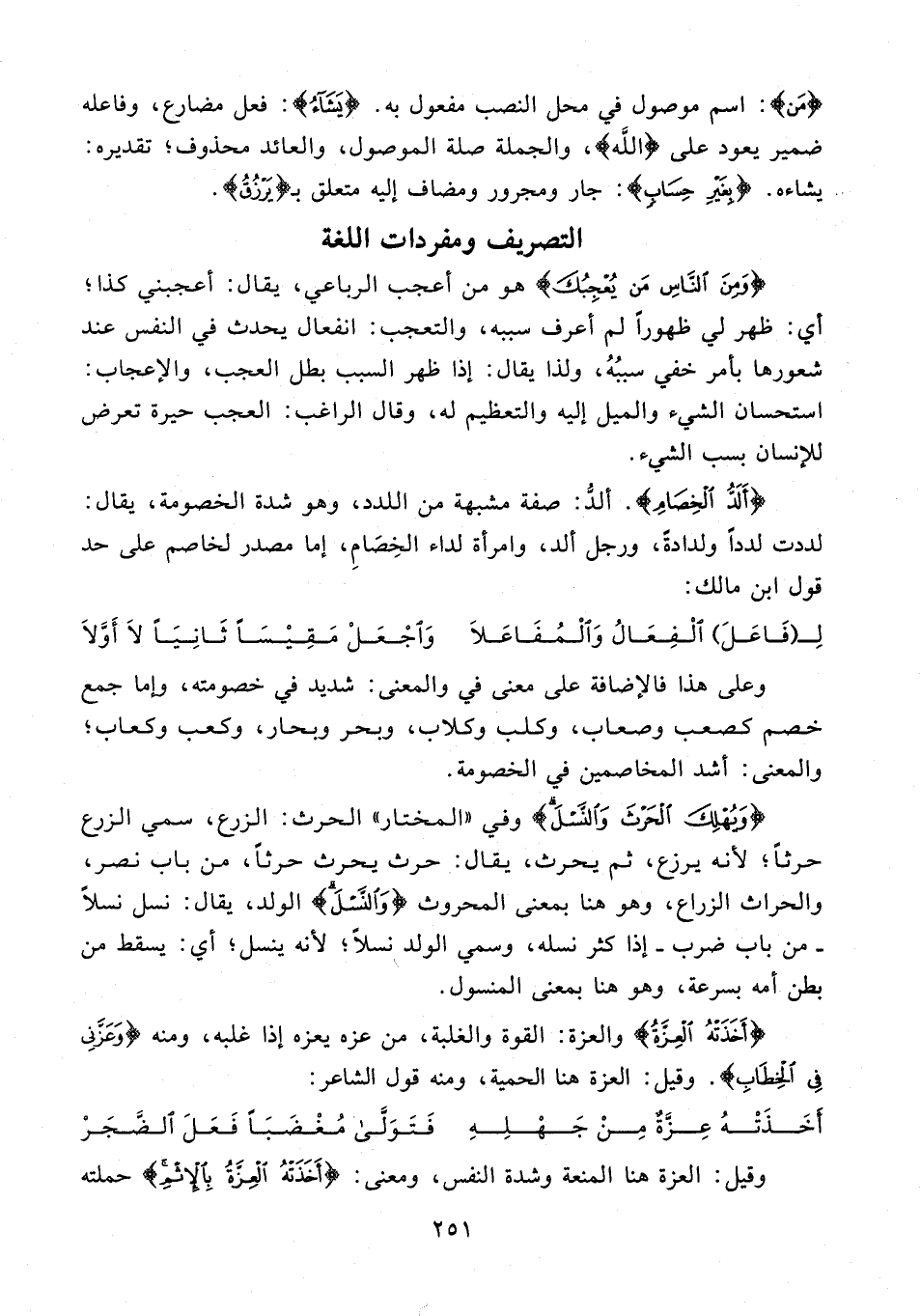 {وَمِنَ النَّاسِ مَنْ يُعْجِبُكَ} هو من أعجب الرباعي، يقال: أعجبني كذا؛ أي: ظهر لي ظهورًا لم أعرف سببه، والتعجب: انفعال يحدث في النفس عند شعورها بأمر خفي سببُهُ، ولذا يقال: إذا ظهر السبب بطل العجب، والإعجاب: استحسان الشيء والميل إليه والتعظيم له، وقال الراغب: العجب حيرة تعرض للإنسان بسب الشيء.