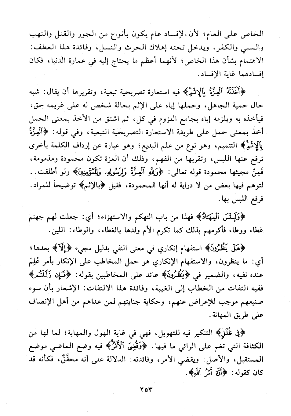 {أَخَذَتْهُ الْعِزَّةُ بِالْإِثْمِ} فيه استعارة تصريحية تبعية، وتقريرها أن يقال: شبه حال حمية الجاهل، وحملها إياه على الإثم بحالة شخص له على غريمه حق، فيأخذه به ويلزمه إياه بجامع اللزوم في كل، ثم اشتق من الأخذ بمعنى الحمل أخذ بمعنى حمل على طريقة الاستعارة التصريحية التبعية، وفي قوله: {الْعِزَّةُ بِالْإِثْمِ} التتميم، وهو نوع من علم البديع؛ وهو عبارة عن إرداف الكلمة بأخرى ترفع عنها اللبس، وتقربها من الفهم، وذلك أن العزة تكون محمودة ومذمومة، فَمِنْ مجيئها محمودة قوله تعالى: {وَلِلَّهِ الْعِزَّةُ وَلِرَسُولِهِ وَلِلْمُؤْمِنِينَ} ولو أطلقت .. لتوهم فيها بعض من لا دراية له أنها المحمودة، فقيل {بالإثم} توضيحًا للمراد. فرفع اللبس بها.