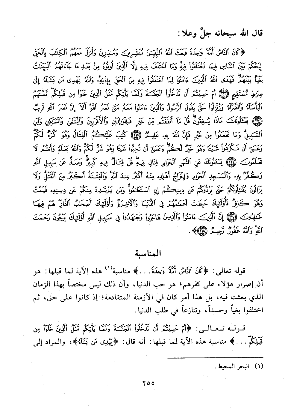 {كَانَ النَّاسُ أُمَّةً وَاحِدَةً فَبَعَثَ اللَّهُ النَّبِيِّينَ مُبَشِّرِينَ وَمُنْذِرِينَ وَأَنْزَلَ مَعَهُمُ الْكِتَابَ بِالْحَقِّ لِيَحْكُمَ بَيْنَ النَّاسِ فِيمَا اخْتَلَفُوا فِيهِ وَمَا اخْتَلَفَ فِيهِ إِلَّا الَّذِينَ أُوتُوهُ مِنْ بَعْدِ مَا جَاءَتْهُمُ الْبَيِّنَاتُ بَغْيًا بَيْنَهُمْ فَهَدَى اللَّهُ الَّذِينَ آمَنُوا لِمَا اخْتَلَفُوا فِيهِ مِنَ الْحَقِّ بِإِذْنِهِ وَاللَّهُ يَهْدِي مَنْ يَشَاءُ إِلَى صِرَاطٍ مُسْتَقِيمٍ (213) أَمْ حَسِبْتُمْ أَنْ تَدْخُلُوا الْجَنَّةَ وَلَمَّا يَأْتِكُمْ مَثَلُ الَّذِينَ خَلَوْا مِنْ قَبْلِكُمْ مَسَّتْهُمُ الْبَأْسَاءُ وَالضَّرَّاءُ وَزُلْزِلُوا حَتَّى يَقُولَ الرَّسُولُ وَالَّذِينَ آمَنُوا مَعَهُ مَتَى نَصْرُ اللَّهِ أَلَا إِنَّ نَصْرَ اللَّهِ قَرِيبٌ (214) يَسْأَلُونَكَ مَاذَا يُنْفِقُونَ قُلْ مَا أَنْفَقْتُمْ مِنْ خَيْرٍ فَلِلْوَالِدَيْنِ وَالْأَقْرَبِينَ وَالْيَتَامَى وَالْمَسَاكِينِ وَابْنِ السَّبِيلِ وَمَا تَفْعَلُوا مِنْ خَيْرٍ فَإِنَّ اللَّهَ بِهِ عَلِيمٌ (215) كُتِبَ عَلَيْكُمُ الْقِتَالُ وَهُوَ كُرْهٌ لَكُمْ وَعَسَى أَنْ تَكْرَهُوا شَيْئًا وَهُوَ خَيْرٌ لَكُمْ وَعَسَى أَنْ تُحِبُّوا شَيْئًا وَهُوَ شَرٌّ لَكُمْ وَاللَّهُ يَعْلَمُ وَأَنْتُمْ لَا تَعْلَمُونَ (216) يَسْأَلُونَكَ عَنِ الشَّهْرِ الْحَرَامِ قِتَالٍ فِيهِ قُلْ قِتَالٌ فِيهِ كَبِيرٌ وَصَدٌّ عَنْ سَبِيلِ اللَّهِ وَكُفْرٌ بِهِ وَالْمَسْجِدِ الْحَرَامِ وَإِخْرَاجُ أَهْلِهِ مِنْهُ أَكْبَرُ عِنْدَ اللَّهِ وَالْفِتْنَةُ أَكْبَرُ مِنَ الْقَتْلِ وَلَا يَزَالُونَ يُقَاتِلُونَكُمْ حَتَّى يَرُدُّوكُمْ عَنْ دِينِكُمْ إِنِ اسْتَطَاعُوا وَمَنْ يَرْتَدِدْ مِنْكُمْ عَنْ دِينِهِ فَيَمُتْ وَهُوَ كَافِرٌ فَأُولَئِكَ حَبِطَتْ أَعْمَالُهُمْ فِي الدُّنْيَا وَالْآخِرَةِ وَأُولَئِكَ أَصْحَابُ النَّارِ هُمْ فِيهَا خَالِدُونَ (217) إِنَّ الَّذِينَ آمَنُوا وَالَّذِينَ هَاجَرُوا وَجَاهَدُوا فِي سَبِيلِ اللَّهِ أُولَئِكَ يَرْجُونَ رَحْمَتَ اللَّهِ وَاللَّهُ غَفُورٌ رَحِيمٌ (218)}.