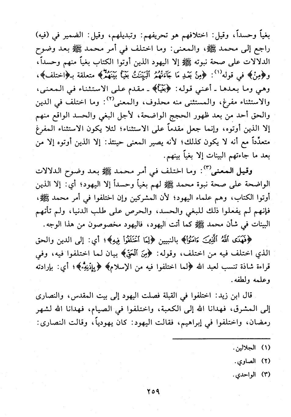 قال ابن زيد: اختلفوا في القبلة فصلت اليهود إلى بيت المقدس، والنصارى إلى المشرق، فهدانا الله إلى الكعبة، واختلفوا في الصيام، فهدانا الله لشهر رمضان، واختلفوا في إبراهيم، فقالت اليهود: كان يهوديًّا، وقالت النصارى: