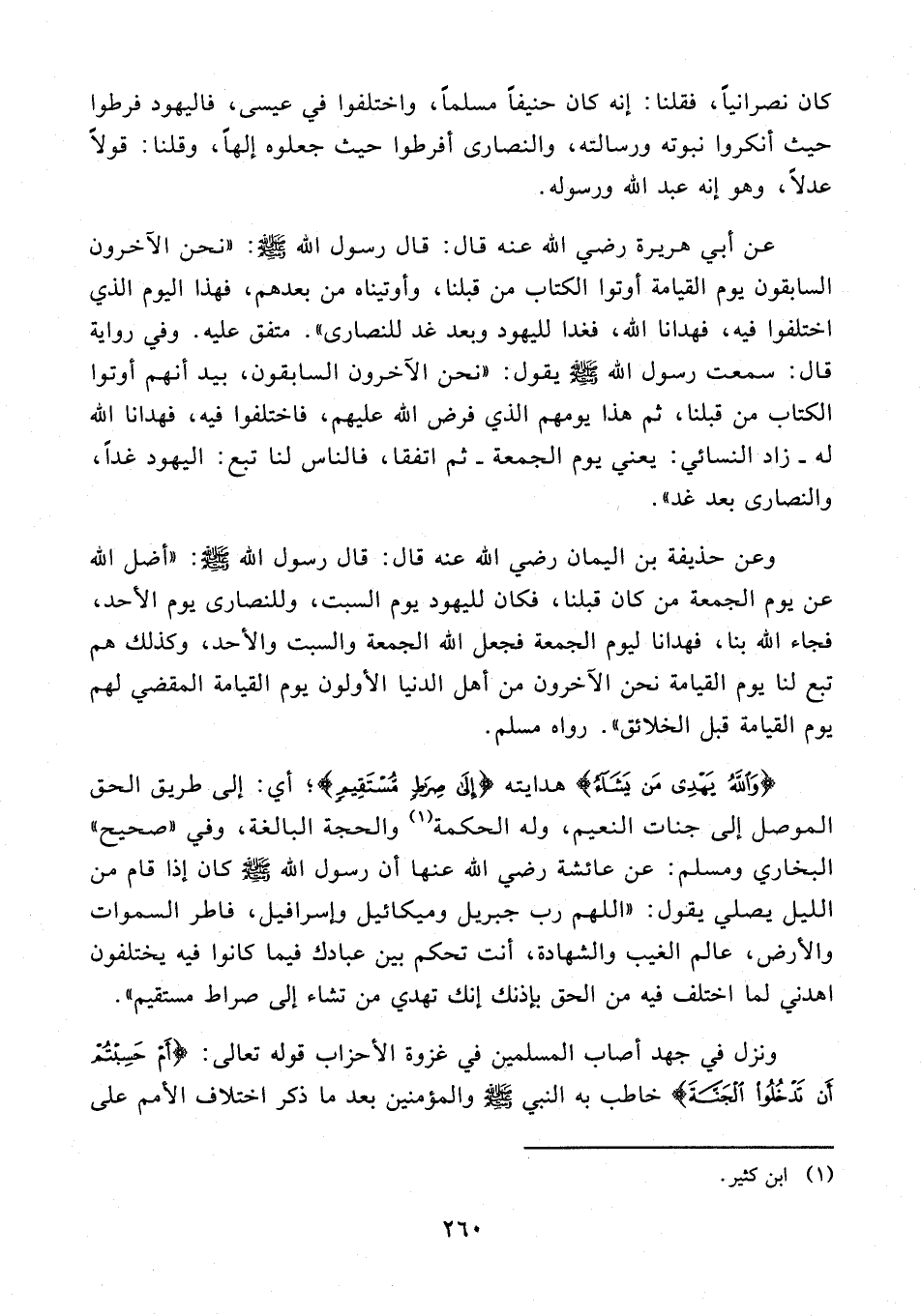 عن أبي هريرة رضي الله عنه قال: قال رسول الله - صلى الله عليه وسلم -: "نحن الآخرون السابقون يوم القيامة أوتوا الكتاب من قبلنا، وأوتيناه من بعدهم، فهذا اليوم الذي اختلفوا فيه، فهدانا الله، فغدا لليهود وبعد غد للنصارى". متفق عليه. وفي رواية قال: سمعت رسول الله - صلى الله عليه وسلم - يقول: "نحن الآخرون السابقون، بيد أنهم أوتوا الكتاب من قبلنا، ثم هذا يومهم الذي فرض الله عليهم، فاختلفوا فيه، فهدانا الله له - زاد النسائي: يعني يوم الجمعة - ثم اتفقا، فالناس لنا تبع: اليهود غدًا، والنصارى بعد غد".