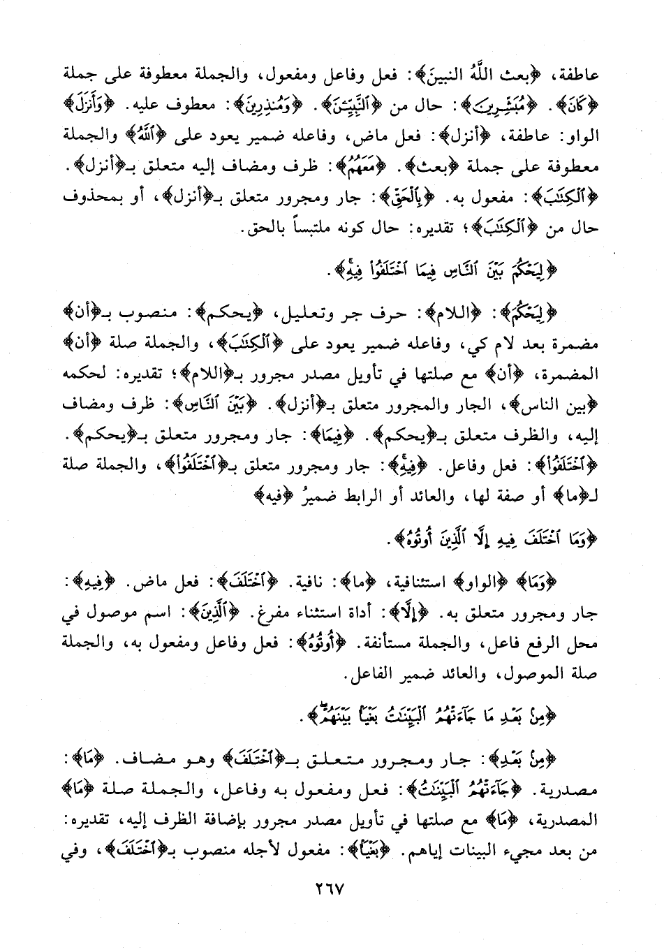 {لِيَحْكُمَ}: {اللام}: حرف جر وتعليل، {يحكم}: منصوب بـ {أن} مضمرة بعد لام كي، وفاعله ضمير يعود على {الْكِتَابَ}، والجملة صلة {أن} المضمرة، {أن} مع صلتها في تأويل مصدر مجرور بـ {اللام}؛ تقديره: لحكمه {بين الناس}، الجار والمجرور متعلق بـ {أنزل}. {بَيْنَ النَّاسِ}: ظرف ومضاف إليه، والظرف متعلق بـ {يحكم}. {فِيمَا}: جار ومجرور متعلق بـ {يحكم}. {اخْتَلَفُوا}: فعل وفاعل. {فِيهِ}: جار ومجرور متعلق بـ {اخْتَلَفُوا}، والجملة صلة لـ {ما} أو صفة لها، والعائد أو الرابط ضميرُ {فيه}.