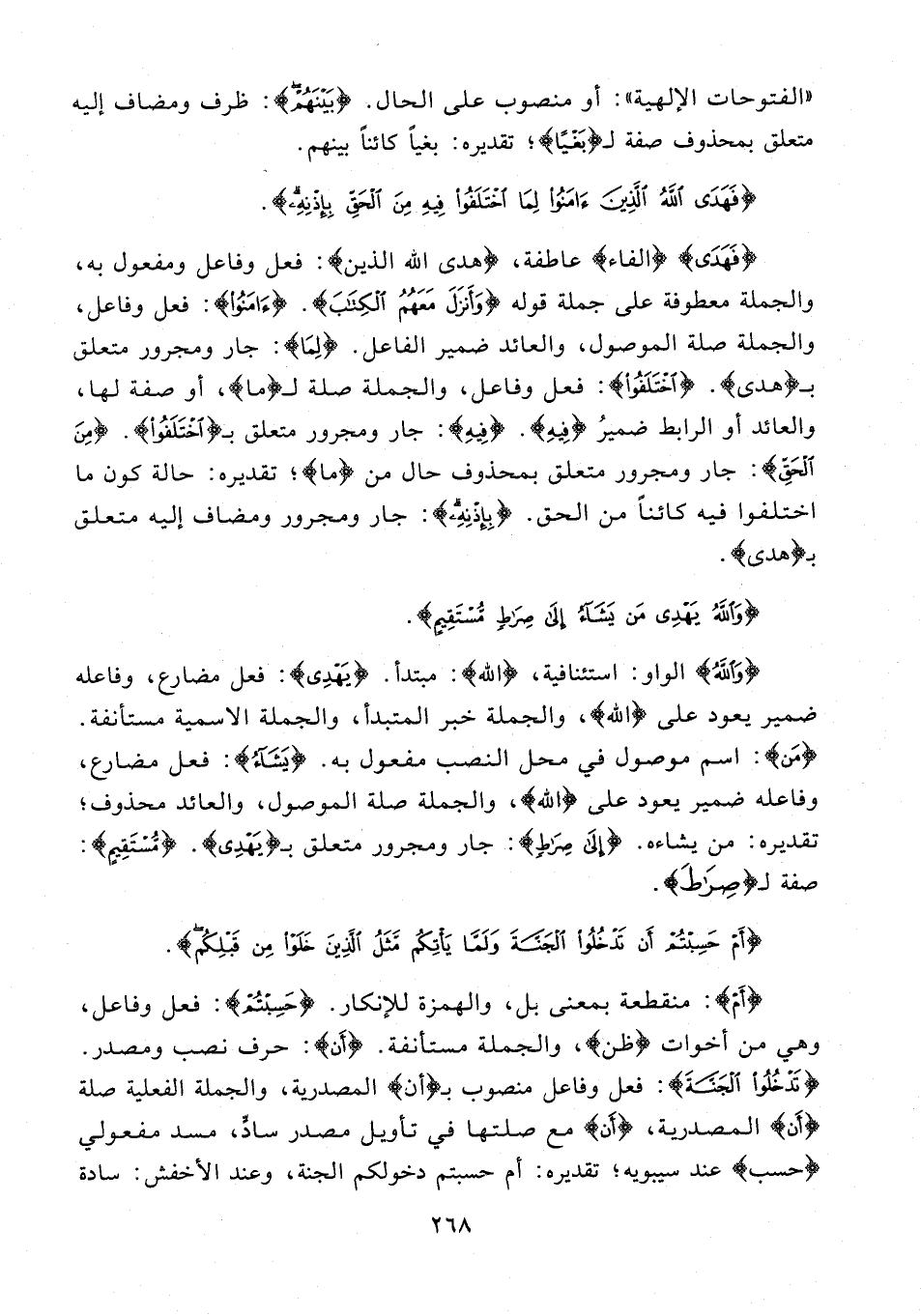{وَاللَّهُ} الواو: استئنافية، {الله}: مبتدأ. {يَهْدِي}: فعل مضارع، وفاعله ضمير يعود على {الله}، والجملة خبر المتبدأ، والجملة الإسمية مستأنفة. {مَن}: اسم موصول في محل النصب مفعول به. {يَشَاءُ}: فعل مضارع، وفاعله ضمير يعود على {الله}، والجملة صلة الموصول، والعائد محذوف؛ تقديره: من يشاءه. {إِلَى صِرَاطٍ}: جار ومجرور متعلق بـ {يَهْدِي}. {مُسْتَقِيمٍ}: صفة لـ {صِرَاطٍ}.