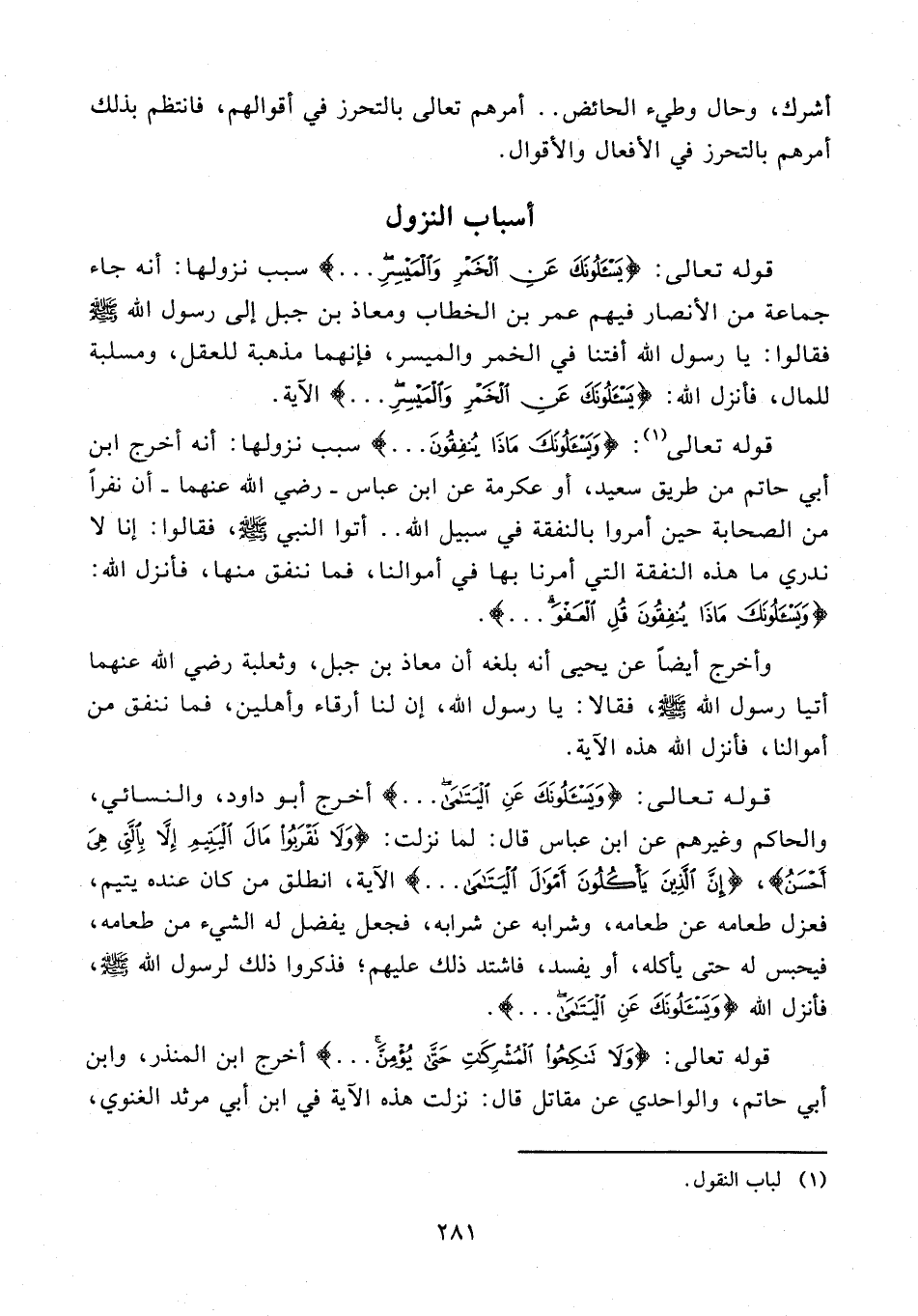 قوله تعالى (¬1): {وَيَسْأَلُونَكَ مَاذَا يُنْفِقُونَ ...} سبب نزولها: أنه أخرج ابن أبي حاتم من طريق سعيد، أو عكرمة عن ابن عباس - رضي الله عنهما - أن نفرًا من الصحابة حين أمروا بالنفقة في سبيل الله .. أتوا النبي - صلى الله عليه وسلم -، فقالوا: إنا لا ندري ما هذه النفقة التي أمرنا بها في أموالنا، فما ننفق منها، فأنزل الله: {وَيَسْأَلُونَكَ مَاذَا يُنْفِقُونَ قُلِ الْعَفْوَ ...}.