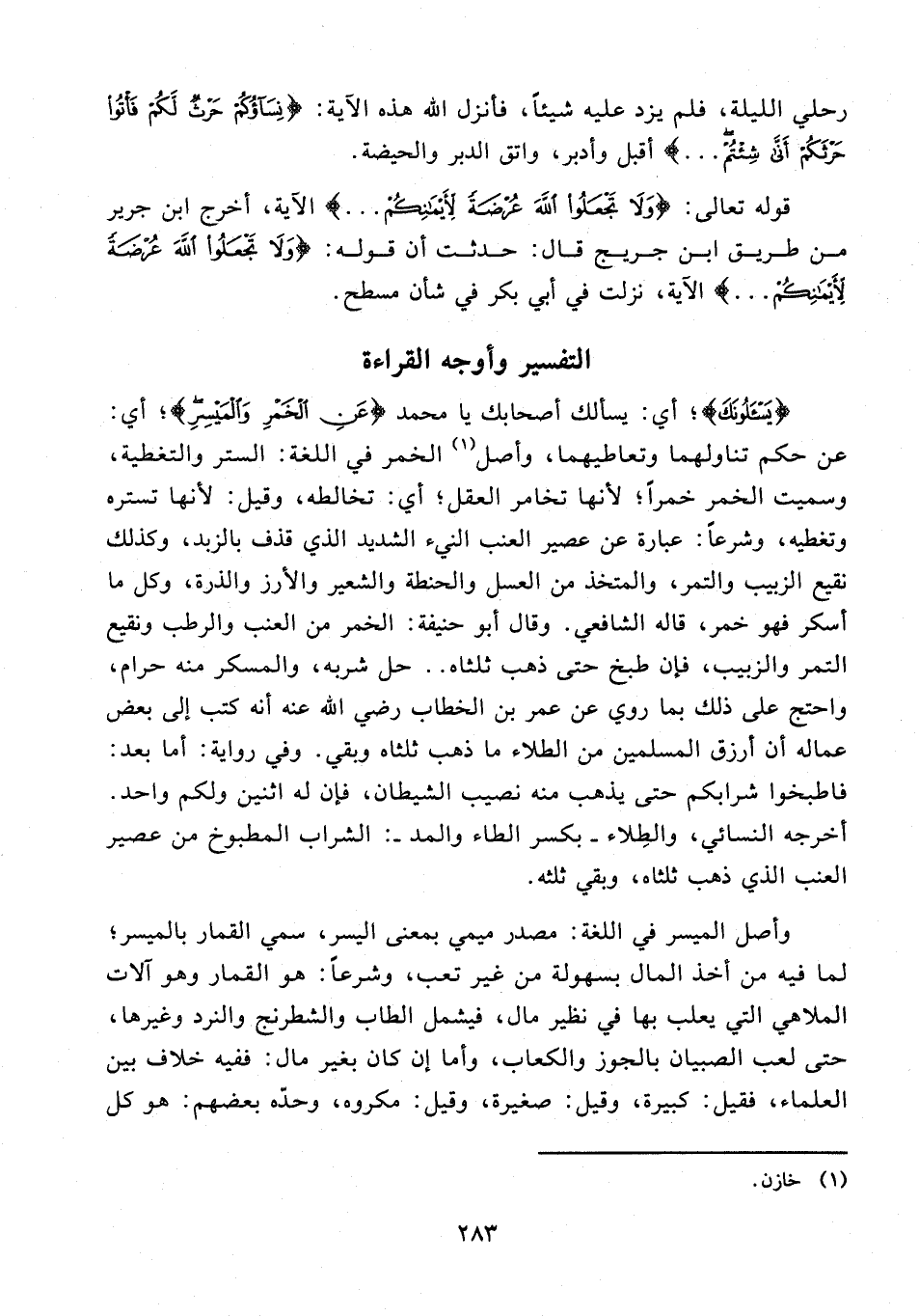 219 - {يَسْأَلُونَكَ}؛ أي: يسألك أصحابك يا محمَّد {عَنِ الْخَمْرِ وَالْمَيْسِرِ}؛ أي: عن حكم تناولهما وتعاطيهما، وأصل (¬1) الخمر في اللغة: الستر والتغطية، وسميت الخمر خمرًا؛ لأنها تخامر العقل؛ أي: تخالطه، وقيل: لأنها تستره وتغطيه، وشرعًا: عبارة عن عصير العنب النيء الشديد الذي قذف بالزبد، وكذلك نقيع الزبيب والتمر، والمتخذ من العسل والحنطة والشعير والأرز والذرة، وكل ما أسكر فهو خمر، قاله الشافعي. وقال أبو حنيفة: الخمر من العنب والرطب ونقيع التمر والزبيب، فإن طبخ حتى ذهب ثلثاه .. حل شربه، والمسكر منه حرام، واحتج على ذلك بما روي عن عمر بن الخطاب رضي الله عنه أنه كتب إلى بعض عماله أن أرزق المسلمين من الطلاء ما ذهب ثلثاه وبقي. وفي رواية: أما بعد: فاطبخوا شرابكم حتى يذهب منه نصيب الشيطان، فإن له اثنين ولكم واحد. أخرجه النسائي، والطِلاء - بكسر الطاء والمد -: الشراب المطبوخ من عصير العنب الذي ذهب ثلثاه، وبقي ثلثه.