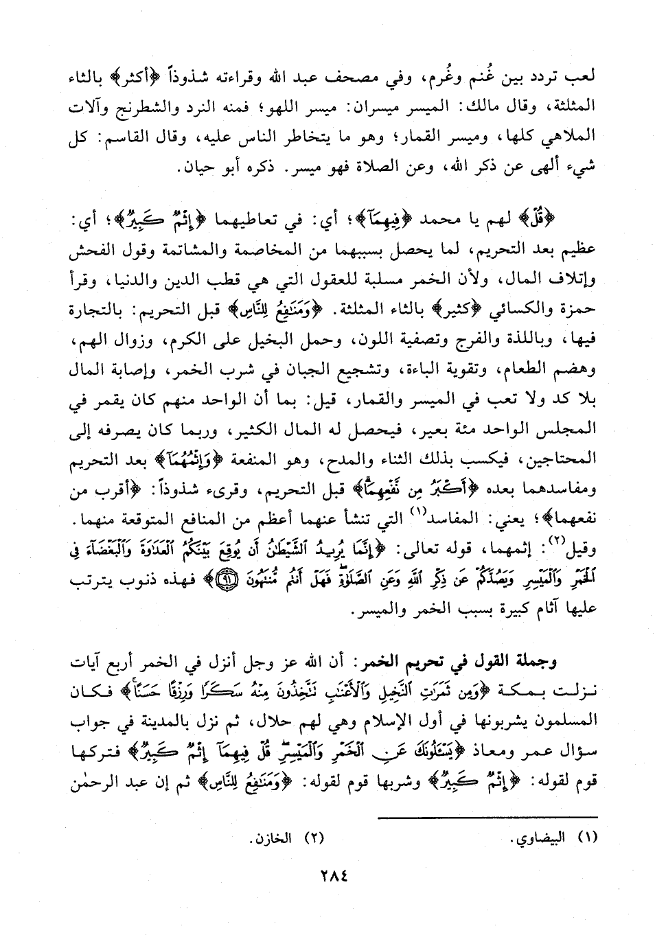 {قُلْ} لهم يا محمَّد {فِيهِمَا}؛ أي: في تعاطيهما {إِثْمٌ كَبِيرٌ}؛ أي: عظيم بعد التحريم، لما يحصل بسببهما من المخاصمة والمشاتمة وقول الفحش وإتلاف المال، ولأن الخمر مسلبة للعقول التي هي قطب الدين والدنيا، وقرأ حمزة والكسائي {كثير} بالثاء المثلثة. {وَمَنَافِعُ لِلنَّاسِ} قبل التحريم: بالتجارة فيها، وباللذة والفرج وتصفية اللون، وحمل البخيل على الكرم، وزوال الهم، وهضم الطعام، وتقوية الباءة، وتشجيع الجبان في شرب الخمر، وإصابة المال بلا كد ولا تعب في الميسر والقمار، قيل: بما أن الواحد منهم كان يقمر في المجلس الواحد مئة بعير، فيحصل له المال الكثير، وربما كان يصرفه إلى المحتاجين، فيكسب بذلك الثناء والمدح، وهو المنفعة {وَإِثْمُهُمَا} بعد التحريم ومفاسدهما بعده {أَكْبَرُ مِنْ نَفْعِهِمَا} قبل التحريم، وقرىء شذوذًا: {أقرب من نفعهما}؛ يعني: المفاسد (¬1) التي تنشأ عنهما أعظم من المنافع المتوقعة منهما. وقيل (¬2): إثمهما، قوله تعالى: {إِنَّمَا يُرِيدُ الشَّيْطَانُ أَنْ يُوقِعَ بَيْنَكُمُ الْعَدَاوَةَ وَالْبَغْضَاءَ فِي الْخَمْرِ وَالْمَيْسِرِ وَيَصُدَّكُمْ عَنْ ذِكْرِ اللَّهِ وَعَنِ الصَّلَاةِ فَهَلْ أَنْتُمْ مُنْتَهُونَ (91)} فهذه ذنوب يترتب عليها آثام كبيرة بسبب الخمر والميسر.