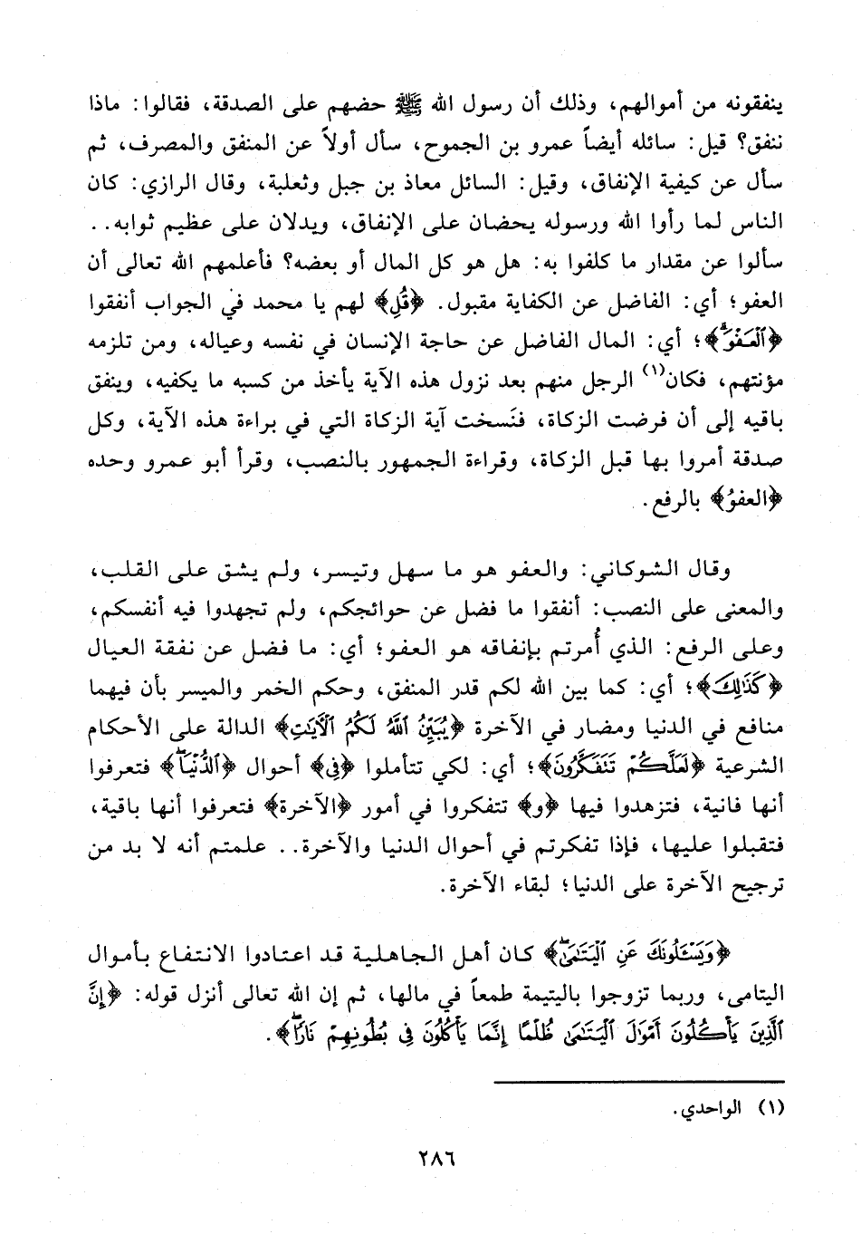 وقال الشوكاني: والعفو هو ما سهل وتيسر، ولم يشق على القلب، والمعنى على النصب: أنفقوا ما فضل عن حوائجكم، ولم تجهدوا فيه أنفسكم، وعلى الرفع: الذي أُمرتم بإنفاقه هو العفو؛ أي: ما فضل عن نفقة العيال {كَذَلِكَ}؛ أي: كما بين الله لكم قدر المنفق، وحكم الخمر والميسر بأن فيهما منافع في الدنيا ومضار في الآخرة {يُبَيِّنُ اللَّهُ لَكُمُ الْآيَاتِ} الدالة على الأحكام