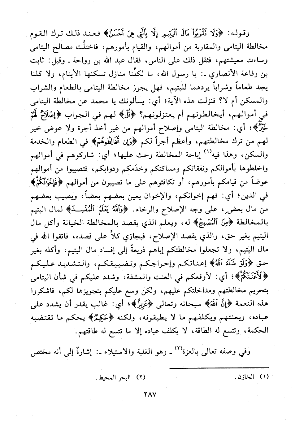 وقوله: {وَلَا تَقْرَبُوا مَالَ الْيَتِيمِ إِلَّا بِالَّتِي هِيَ أَحْسَنُ} فعند ذلك ترك القوم مخالطة اليتامى والمقاربة من أموالهم، والقيام بأمورهم، فاختلَّت مصالح اليتامى وساءت معيشتهم، فثقل ذلك على الناس، فقال عبد الله بن رواحة - وقيل: ثابت بن رفاعة الأنصاري -: يا رسول الله، ما لكلِّنا منازل تسكنها الأيتام، ولا كلنا يجد طعامًا وشرابًا يردهما لليتيم، فهل يجوز مخالطة اليتامى بالطعام والشراب والمسكن أم لا؟ فنزلت هذه الآية؛ أي: يسألونك يا محمَّد عن مخالطة اليتامى في أموالهم، أيخالطونهم أم يعتزلونهم؟ {قُلْ} لهم في الجواب {إِصْلَاحٌ لَهُمْ خَيْرٌ}؛ أي: مخالطة اليتامى وإصلاح أموالهم من غير أخذ أجرة ولا عوض خير لهم من ترك مخالطتهم، وأعظم أجرًا لكم {وَإِنْ تُخَالِطُوهُمْ} في الطعام والخدمة والسكن، وهذا فيه (¬1) إباحة المخالطة وحث عليها؛ أي: شاركوهم في أموالهم واخلطوها بأموالكم ونفقاتكم ومساكنكم وخدَمكم ودوابكم، فتصيبوا من أموالهم عوضًا من قيامكم بأمورهم، أو تكافئوهم على ما تصيبون من أموالهم {فَإِخْوَانُكُمْ} في الدين؛ أي: فهم إخوانكم، والإخوان يعين بعضهم بعضًا، ويصيب بعضهم من مال بعضٍ، على وجه الإصلاح والرخاء. {وَاللَّهُ يَعْلَمُ الْمُفْسِدَ} لمال اليتيم بالمخالطة {مِنَ الْمُصْلِحِ} له، ويعلم الذي يقصد بالمخالطة الخيانة وأكل مال اليتيم بغير حق، والذي يقصد الإصلاح، فيجازي كلًّا على قصده، فاتقوا الله في مال اليتيم، ولا تجعلوا مخالطتكم إياهم ذريعةً إلى إفساد مال اليتيم، وأكله بغير حق {وَلَوْ شَاءَ اللَّهُ} إعناتكم وإحراجكم وتضييقكم، والتشديد عليكم {لَأَعْنَتَكُمْ}؛ أي: لأوقعكم في العنت والمشقة، وشدد عليكم في شأن اليتامى بتحريم مخالطتهم ومداخلتكم عليهم، ولكن وسع عليكم بتجويزها لكم، فاشكروا هذه النعمة {إِنَّ اللَّهَ} سبحانه وتعالى {عَزِيزٌ}؛ أي: غالب يقدر أن يشدد على عباده، ويعنتهم ويكلفهم ما لا يطيقونه، ولكنه {حَكِيمٌ} يحكم ما تقتضيه الحكمة، وتتسع له الطاقة، لا يكلف عباده إلا ما تتسع له طاقتهم.