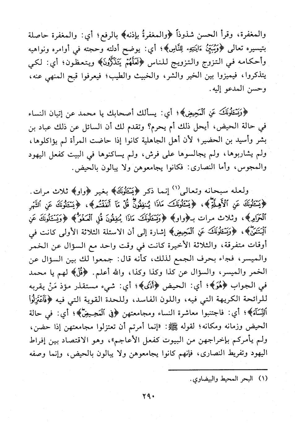 222 - {وَيَسْأَلُونَكَ عَنِ الْمَحِيضِ}؛ أي: يسألك أصحابك يا محمَّد عن إتيان النساء في حالة الحيض، أيحل ذلك أم يحرم؟ وتقدم لك أن السائل عن ذلك عباد بن بشر وأسيد بن الحضير؛ لأن أهل الجاهلية كانوا إذا حاضت المرأة لم يؤاكلوها، ولم يشاربوها، ولم يجالسوها على فرش، ولم يساكنوها في البيت كفعل اليهود والمجوس، وأما النصارى؛ فكانوا يجامعوهن ولا يبالون بالحيض.