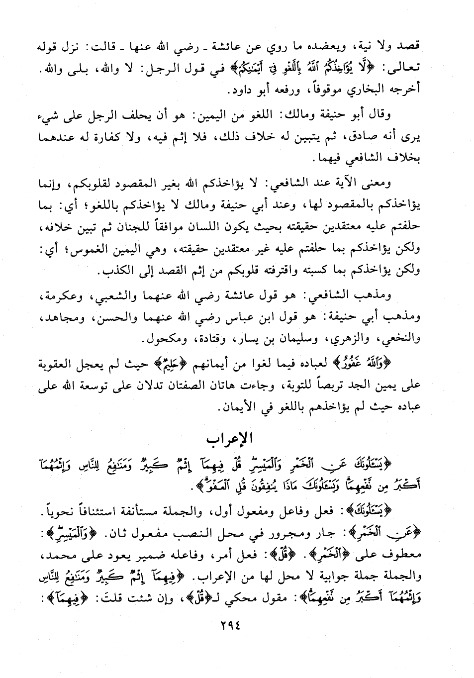 {يَسْأَلُونَكَ}: فعل وفاعل ومفعول أول، والجملة مستأنفة استئنافًا نحويًّا. {عَنِ الْخَمْرِ}: جار ومجرور في محل النصب مفعول ثان. {وَالْمَيْسِرِ}: معطوف على {الْخَمْرِ}. {قُلْ}: فعل أمر، وفاعله ضمير يعود على محمَّد، والجملة جملة جوابية لا محل لها من الإعراب. {فِيهِمَا إِثْمٌ كَبِيرٌ وَمَنَافِعُ لِلنَّاسِ وَإِثْمُهُمَا أَكْبَرُ مِنْ نَفْعِهِمَا}: مقول محكي لـ {قُلْ}، وإن شئت قلتَ: {فِيهِمَا}: