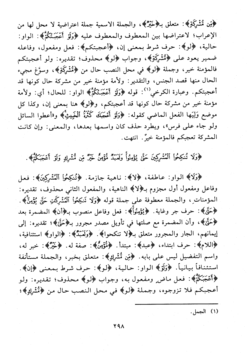 {مِنْ مُشْرِكَةٍ}: متعلق بـ {خَيْرٌ}، والجملة الإسمية جملة اعتراضية لا محل لها من الإعراب؛ لاعتراضها بين المعطوف والمعطوف عليه {وَلَوْ أَعْجَبَتْكُمْ}: الواو: حالية، {لو}: حرف شرط بمعنى إن، {أعجبتكم}: فعل ومفعول، وفاعله ضمير يعود على {مُشْرِكَةٍ}، وجواب {لو} محذوف؛ تقديره: ولو أعجبتكم فالمؤمنة خير، وجملة {لو} في محل النصب حال من {مُشْرِكَةٍ}، وسوَّغ مجيء الحال منها قصد الجنس، والتقدير: ولأمة مؤمنة خير من مشركة حال كونها قد أعجبتكم. وعبارة الكرخي (¬1): قوله {وَلَوْ أَعْجَبَتْكُمْ} الواو: للحال؛ أي: ولأمة مؤمنة خير من مشركة حال كونها قد أعجبتكم، و {لو} هنا بمعنى إن، وكذا كل موضع وَلِيَها الفعل الماضي كقوله: {وَلَوْ أَعْجَبَكَ كَثْرَةُ الْخَبِيثِ} و"أعطوا السائل ولو جاء على فرس"، ويطرد حذف كان واسمها بعدها، والمعنى: وإن كانت المشركة تعجبكم فالمؤمنة خيرٌ. انتهت.
