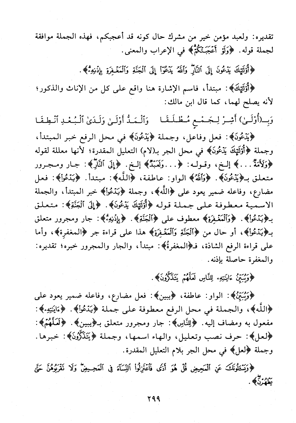 {يَدْعُونَ}: فعل وفاعل، وجملة {يَدْعُونَ} في محل الرفع خبر المبتدأ، وجملة {أُولَئِكَ يَدْعُونَ} في محل الجر بـ (لام) التعليل المقدرة؛ لأنها معللة لقوله {وَلَأَمَةٌ ...} إلخ، وقوله: {... وَلَعَبْدٌ} إلخ. {إِلَى النَّارِ}: جار ومجرور متعلق بـ {يَدْعُون}. {وَاللَّهُ} الواو: عاطفة، {الله}: مبتدأ. {يَدْعُو}: فعل مضارع، وفاعله ضمير يعود على {الله}، وجملة {يَدْعُو} خبر المبتدأ، والجملة الإسمية معطوفة على جملة قوله {أُولَئِكَ يَدْعُونَ}. {إِلَى الْجَنَّةِ}: متعلق بـ {يَدْعُو}. {وَالْمَغْفِرَةِ} معطوف على {الْجَنَّةِ}. {بِإِذْنِهِ}: جار ومجرور متعلق بـ {يَدْعُو}، أو حال من {الْجَنَّةِ وَالْمَغْفِرَةِ} هذا على قراءة جر {المغفرِة}، وأما على قراءة الرفع الشاذة، فـ {المغفرةُ}: مبتدأ، والجار والمجرور خبره؛ تقديره: والمغفرة حاصلة بإذنه.