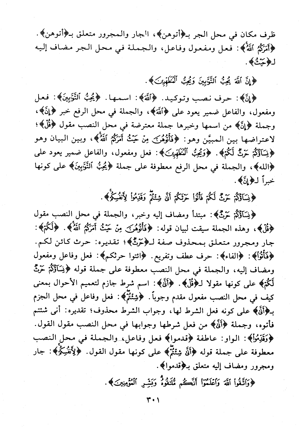 {إِنَّ}: حرف نصب وتوكيد. {اللَّهَ}: اسمها. {يُحِبُّ التَّوَّابِينَ}: فعل ومفعول، والفاعل ضمير يعود على {اللَّهَ}، والجملة في محل الرفع خبر {إنَّ}، وجملة {إِنَّ} من اسمها وخبرها جملة معترضة في محل النصب مقول {قُلْ}؛ لاعتراضها بين المبيَّن وهو: {فَأْتُوهُنَّ مِنْ حَيْثُ أَمَرَكُمُ اللَّهُ}، وبين البيان وهو {نِسَاؤُكُمْ حَرْثٌ لَكُمْ}. {وَيُحِبُّ الْمُتَطَهِّرِينَ}: فعل ومفعول، والفاعل ضمير يعود على {الله}، والجملة في محل الرفع معطوفة على جملة {يُحِبُّ التَّوَّابِينَ} على كونها خبرًا لـ {إِنَّ}.