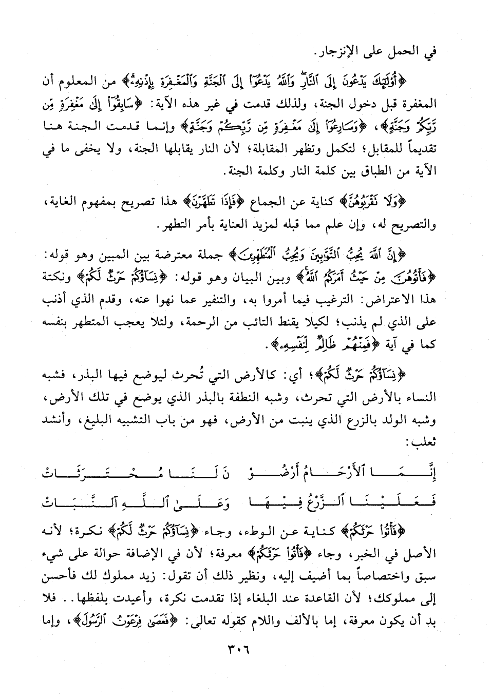 {فَأْتُوا حَرْثَكُمْ} كناية عن الوطء، وجاء {نِسَاؤُكُمْ حَرْثٌ لَكُمْ} نكرة؛ لأنه الأصل في الخبر، وجاء {فَأْتُوا حَرْثَكُمْ} معرفة؛ لأن في الإضافة حوالة على شيء سبق واختصاصًا بما أضيف إليه، ونظير ذلك أن تقول: زيد مملوك لك فأحسن إلى مملوكك؛ لأن القاعدة عند البلغاء إذا تقدمت نكرة، وأعيدت بلفظها .. فلا بد أن يكون معرفة، إما بالألف واللام كقوله تعالى: {فَعَصَى فِرْعَوْنُ الرَّسُولَ}، وإما