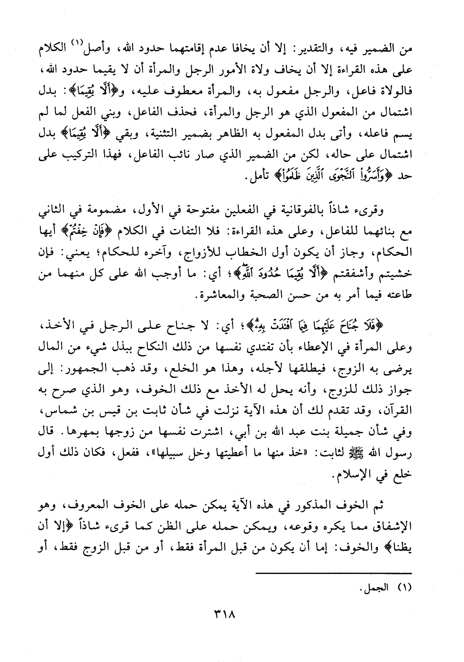 من الضمير فيه، والتقدير: إلا أن يخافا عدم إقامتهما حدود الله، وأصل (¬1) الكلام على هذه القراءة إلا أن يخاف ولاة الأمور الرجل والمرأة أن لا يقيما حدود الله، فالولاة فاعل، والرجل مفعول به، والمرأة معطوف عليه، و {أَلَّا يُقِيمَا}: بدل اشتمال من المفعول الذي هو الرجل والمرأة، فحذف الفاعل، وبني الفعل لما لم يسم فاعله، وأتى بدل المفعول به الظاهر بضمير التثنية، وبقي {أَلَّا يُقِيمَا} بدل اشتمال على حاله، لكن من الضمير الذي صار نائب الفاعل، فهذا التركيب على حد {وَأَسَرُّوا النَّجْوَى الَّذِينَ ظَلَمُوا} تأمل.