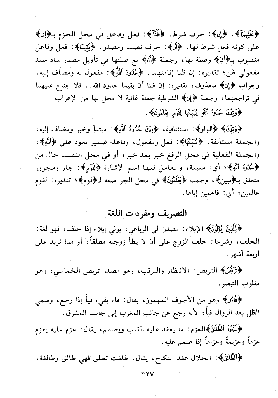 {وَتِلْكَ} {الواو}: استئنافية، {تِلْكَ حُدُودُ اللَّهِ}: مبتدأ وخبر ومضاف إليه، والجملة مستأنفة. {يُبَيِّنُهَا}: فعل ومفعول، وفاعله ضمير يعود على {اللَّهِ}، والجملة الفعلية في محل الرفع خبر بعد خبر، أو في محل النصب حال من {حُدُودَ اللَّهِ}؛ أي: مبينة، والعامل فيها اسم الإشارة {لِقَوْمٍ}: جار ومجرور متعلق بـ {يبين}، وجملة {يَعْلَمُونَ} في محل الجر صفة لـ {قوم}؛ تقديره: لقوم عالمين؛ أي: فاهمين إياها.