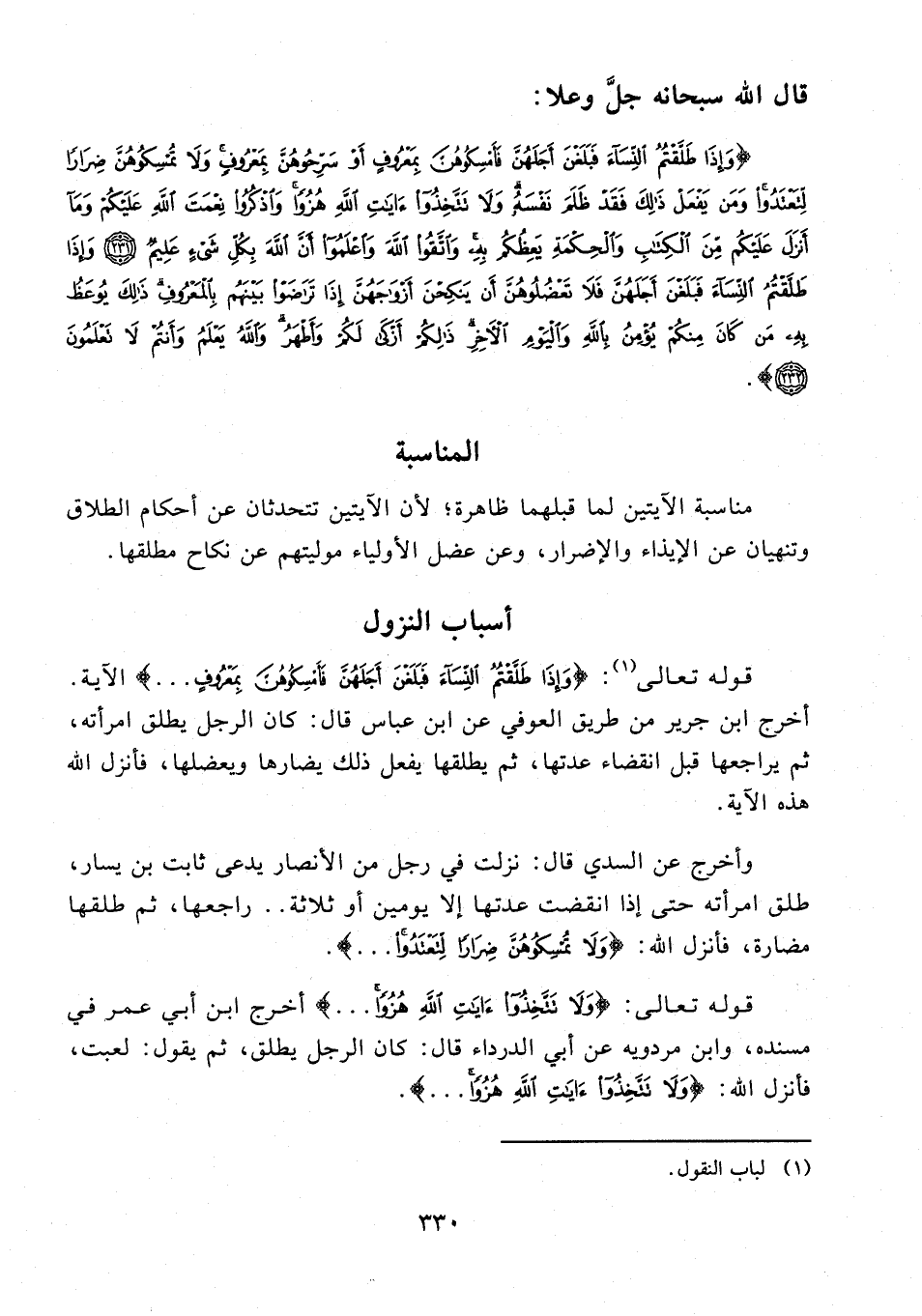 {وَإِذَا طَلَّقْتُمُ النِّسَاءَ فَبَلَغْنَ أَجَلَهُنَّ فَأَمْسِكُوهُنَّ بِمَعْرُوفٍ أَوْ سَرِّحُوهُنَّ بِمَعْرُوفٍ وَلَا تُمْسِكُوهُنَّ ضِرَارًا لِتَعْتَدُوا وَمَنْ يَفْعَلْ ذَلِكَ فَقَدْ ظَلَمَ نَفْسَهُ وَلَا تَتَّخِذُوا آيَاتِ اللَّهِ هُزُوًا وَاذْكُرُوا نِعْمَتَ اللَّهِ عَلَيْكُمْ وَمَا أَنْزَلَ عَلَيْكُمْ مِنَ الْكِتَابِ وَالْحِكْمَةِ يَعِظُكُمْ بِهِ وَاتَّقُوا اللَّهَ وَاعْلَمُوا أَنَّ اللَّهَ بِكُلِّ شَيْءٍ عَلِيمٌ (231) وَإِذَا طَلَّقْتُمُ النِّسَاءَ فَبَلَغْنَ أَجَلَهُنَّ فَلَا تَعْضُلُوهُنَّ أَنْ يَنْكِحْنَ أَزْوَاجَهُنَّ إِذَا تَرَاضَوْا بَيْنَهُمْ بِالْمَعْرُوفِ ذَلِكَ يُوعَظُ بِهِ مَنْ كَانَ مِنْكُمْ يُؤْمِنُ بِاللَّهِ وَالْيَوْمِ الْآخِرِ ذَلِكُمْ أَزْكَى لَكُمْ وَأَطْهَرُ وَاللَّهُ يَعْلَمُ وَأَنْتُمْ لَا تَعْلَمُونَ (232)}.