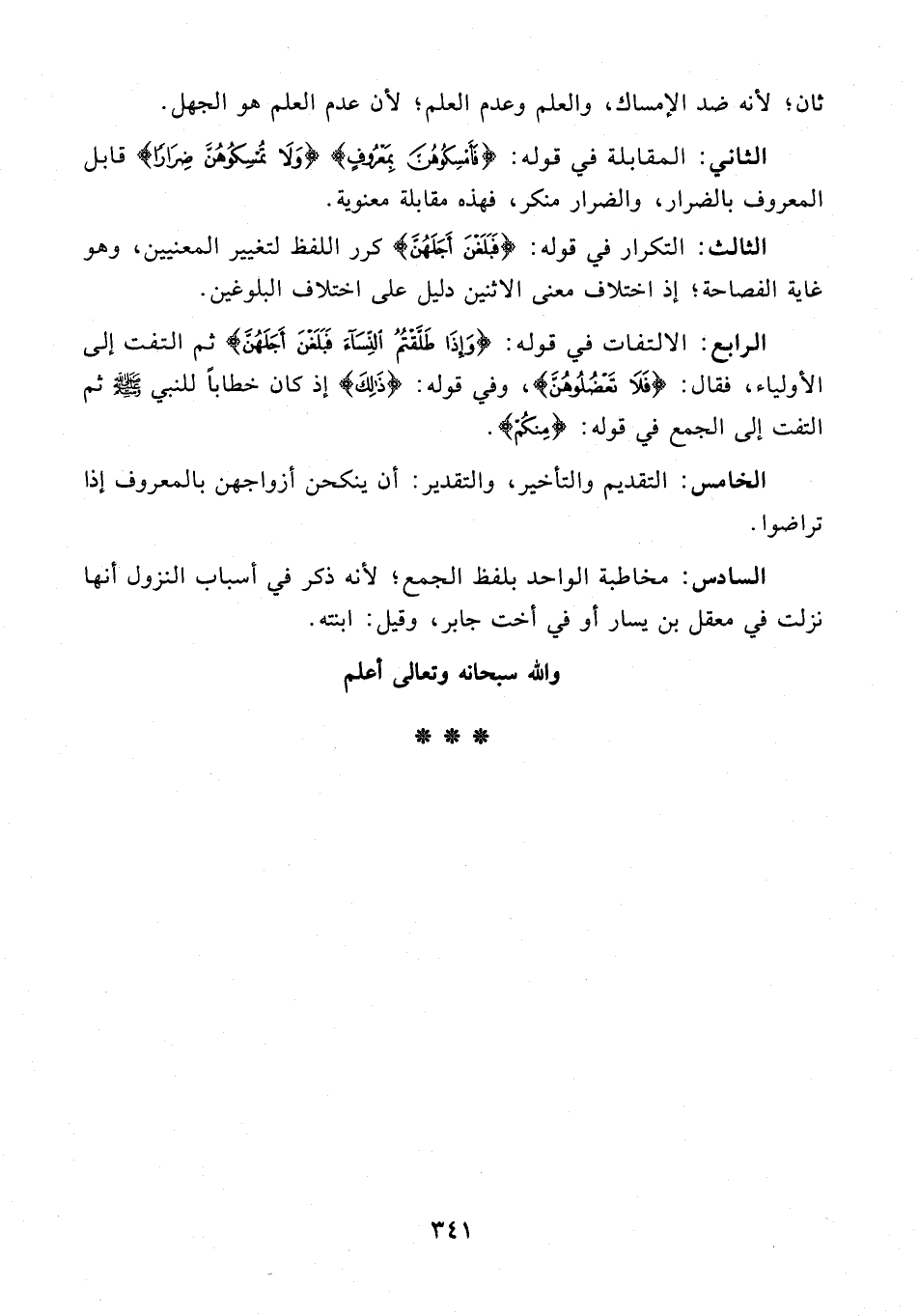 السادس: مخاطبة الواحد بلفظ الجمع؛ لأنه ذكر في أسباب النزول أنها نزلت في معقل بن يسار أو في أخت جابر، وقيل: ابنته.