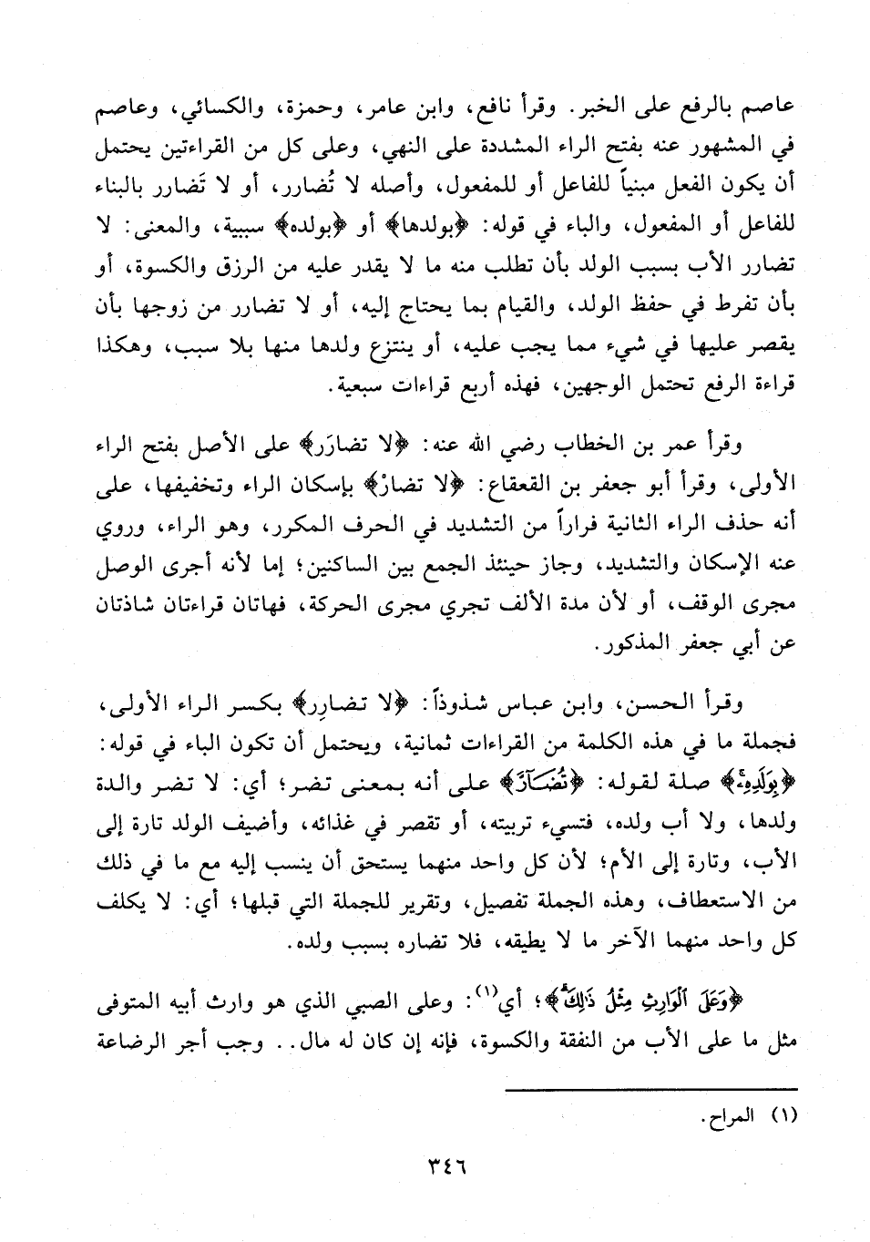 عاصم بالرفع على الخبر. وقرأ نافع، وابن عامر، وحمزة، والكسائي، وعاصم في المشهور عنه بفتح الراء المشددة على النهي، وعلى كل من القراءتين يحتمل أن يكون الفعل مبنيًّا للفاعل أو للمفعول، وأصله لا تُضارر، أو لا تَضارر بالبناء للفاعل أو المفعول، والباء في قوله: {بولدها} أو {بولده} سببية، والمعنى: لا تضارر الأب بسبب الولد بأن تطلب منه ما لا يقدر عليه من الرزق والكسوة، أو بأن تفرط في حفظ الولد، والقيام بما يحتاج إليه، أو لا تضارر من زوجها بأن يقصر عليها في شيء مما يجب عليه، أو ينتزع ولدها منها بلا سبب، وهكذا قراءة الرفع تحتمل الوجهين، فهذه أربع قراءات سبعية.