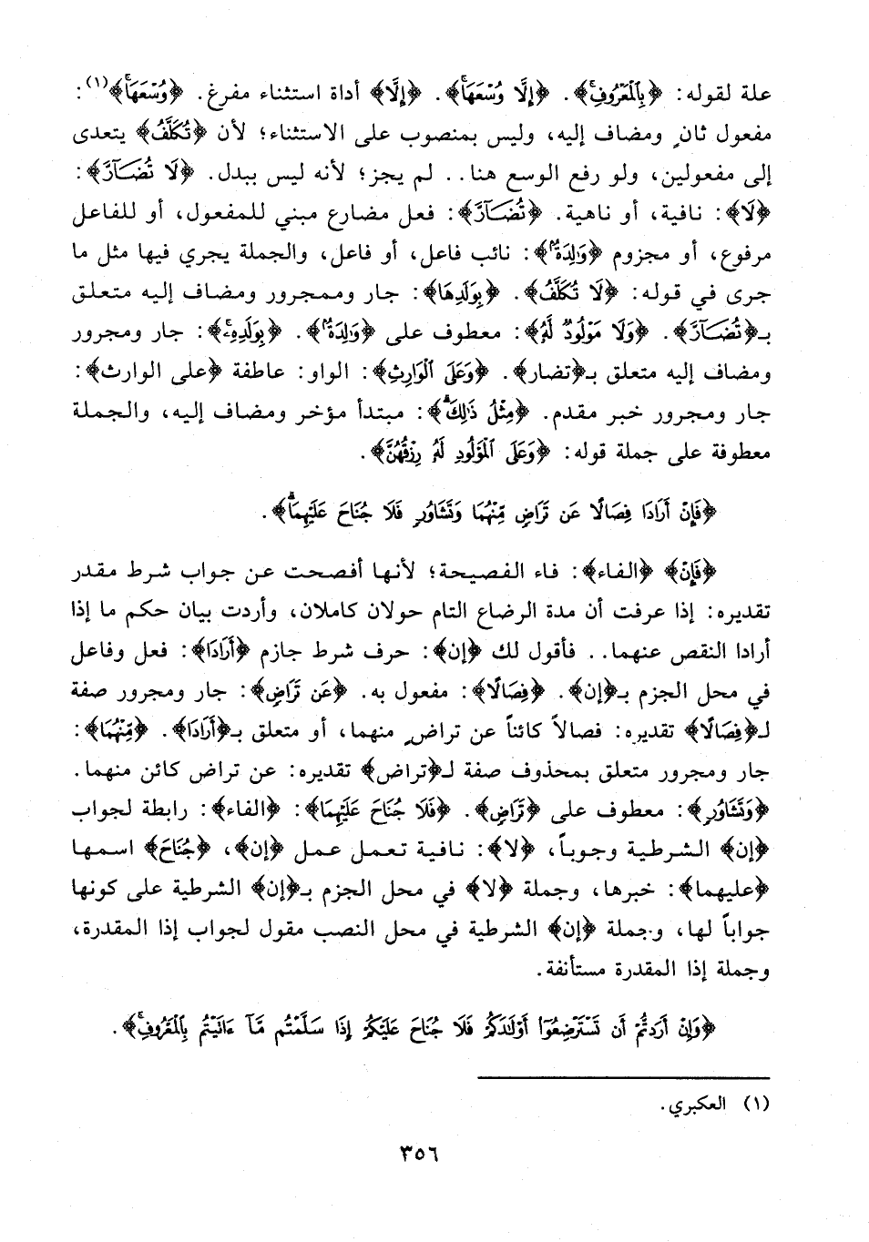 علة لقوله: {بِالْمَعْرُوفِ}. {إِلَّا وُسْعَهَا}. {إلّا} أداة استثناء مفرغ. {وُسْعَهَا} (¬1): مفعول ثانٍ ومضاف إليه، وليس بمنصوب على الاستثناء؛ لأن {تُكَلَّفُ} يتعدى إلى مفعولين، ولو رفع الوسع هنا .. لم يجز؛ لأنه ليس ببدل. {لَا تُضَارَّ}: {لَا}: نافية، أو ناهية. {تُضَارَّ}: فعل مضارع مبني للمفعول، أو للفاعل مرفوع، أو مجزوم {وَالِدَةٌ}: نائب فاعل، أو فاعل، والجملة يجري فيها مثل ما جرى في قوله: {لَا تُكَلَّفُ}. {بِوَلَدِهَا}: جار ومجرور ومضاف إليه متعلق بـ {تُضَارَّ}. {وَلَا مَوْلُودٌ لَهُ}: معطوف على {وَالِدَةٌ}. {بِوَلَدِهِ}: جار ومجرور ومضاف إليه متعلق بـ {تضار}. {وَعَلَى الْوَارِثِ}: الواو: عاطفة {على الوارث}: جار ومجرور خبر مقدم. {مِثْلُ ذَلِكَ}: مبتدأ مؤخر ومضاف إليه، والجملة معطوفة على جملة قوله: {وَعَلَى الْمَوْلُودِ لَهُ رِزْقُهُنَّ}.