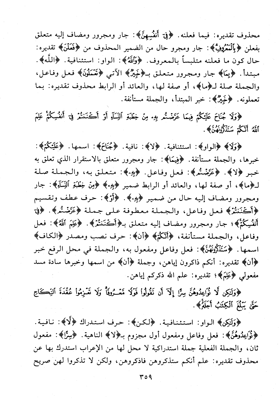 {وَلَا} {الواو}: استئنافية. {لا}: نافية. {جُنَاحَ}: اسمها. {عَلَيْكُمْ}: خبرها، والجملة مستأنفة. {فِيمَا}: جار ومجرور متعلق بالاستقرار الذي تعلق به خبر {لا}. {عَرَّضْتُمْ}: فعل وفاعل. {بِهِ}: متعلق به، والجملة صلة لـ {ما}، أو صفة لها، والعائد أو الرابط ضمير {بِهِ} {مِنْ خِطْبَةِ النِّسَاءِ}: جار ومجرور ومضاف إليه حال من ضمير {بِهِ}. {أَوْ}: حرف عطف وتقسيم {أَكْنَنْتُمْ} فعل وفاعل، والجملة معطوفة على جملة {عَرَّضْتُمْ}. {فِي أَنْفُسِكُمْ}؛ جار ومجرور ومضاف إليه متعلق بـ {أَكْنَنْتُمْ}. {عَلِمَ اللَّهُ}: فعل وفاعل، والجملة مستأنفة، {أَنَّكُمْ} {أن}: حرف نصب ومصدر {الكاف} اسمها. {سَتَذْكُرُونَهُنَّ}: فعل وفاعل ومفعول به، والجملة في محل الرفع خبر {أن} تقديره: أنكم ذاكرون إياهن، وجملة {أن} من اسمها وخبرها سادة مسد مفعولي {عَلِمَ}؛ تقديره: علم الله ذكركم إياهن.