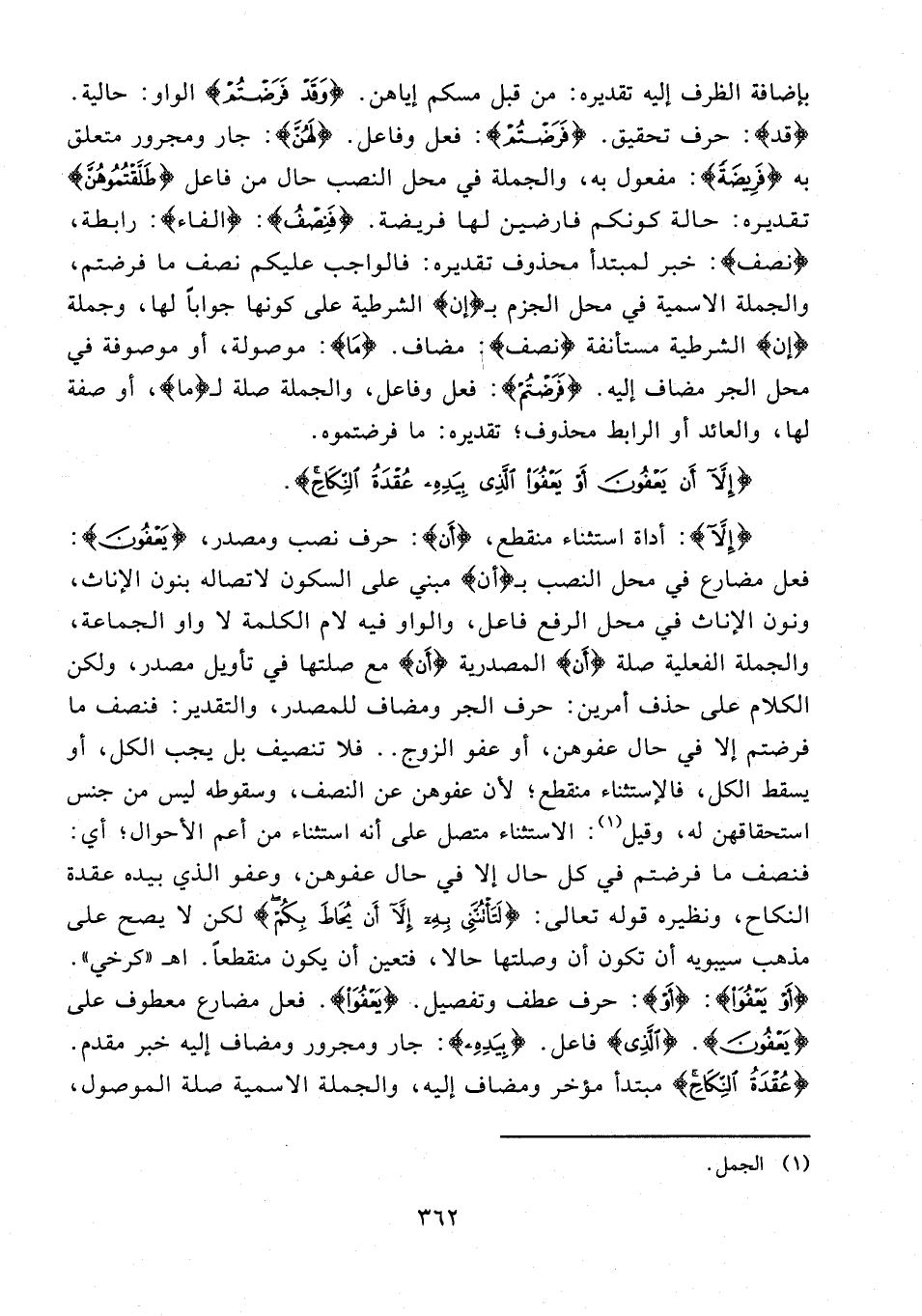 {إِلَّا}: أداة استثناء منقطع، {أَن}: حرف نصب ومصدر، {يَعْفُونَ}: فعل مضارع في محل النصب بـ {أن} مبني على السكون لاتصاله بنون الإناث، ونون الإناث في محل الرفع فاعل، والواو فيه لام الكلمة لا واو الجماعة، والجملة الفعلية صلة {أَن} المصدرية {أَن} مع صلتها في تأويل مصدر، ولكن الكلام على حذف أمرين: حرف الجر ومضاف للمصدر، والتقدير: فنصف ما فرضتم إلا في حال عفوهن، أو عفو الزوج .. فلا تنصيف بل يجب الكل، أو يسقط الكل، فالاستثناء منقطع؛ لأن عفوهن عن النصف، وسقوطه ليس من جنس استحقاقهن له، وقيل (¬1): الاستثناء متصل على أنه استثناء من أعم الأحوال؛ أي: فنصف ما فرضتم في كل حال إلا في حال عفوهن، وعفو الذي بيده عقدة النكاح، ونظيره قوله تعالى: {لَتَأْتُنَّنِي بِهِ إِلَّا أَنْ يُحَاطَ بِكُمْ} لكن لا يصح على مذهب سيبويه أن تكون أن وصلتها حالًا، فتعين أن يكون منقطعًا. اهـ "كرخي". {أَوْ يَعْفُوَ}: {أَوْ}: حرف عطف وتفصيل. {يَعْفُوَ}. فعل مضارع معطوف على {يَعْفُونَ}. {الَّذِي} فاعل. {بِيَدِهِ}: جار ومجرور ومضاف إليه خبر مقدم. {عُقْدَةُ النِّكَاحِ} مبتدأ مؤخر ومضاف إليه، والجملة الإسمية صلة الموصول،