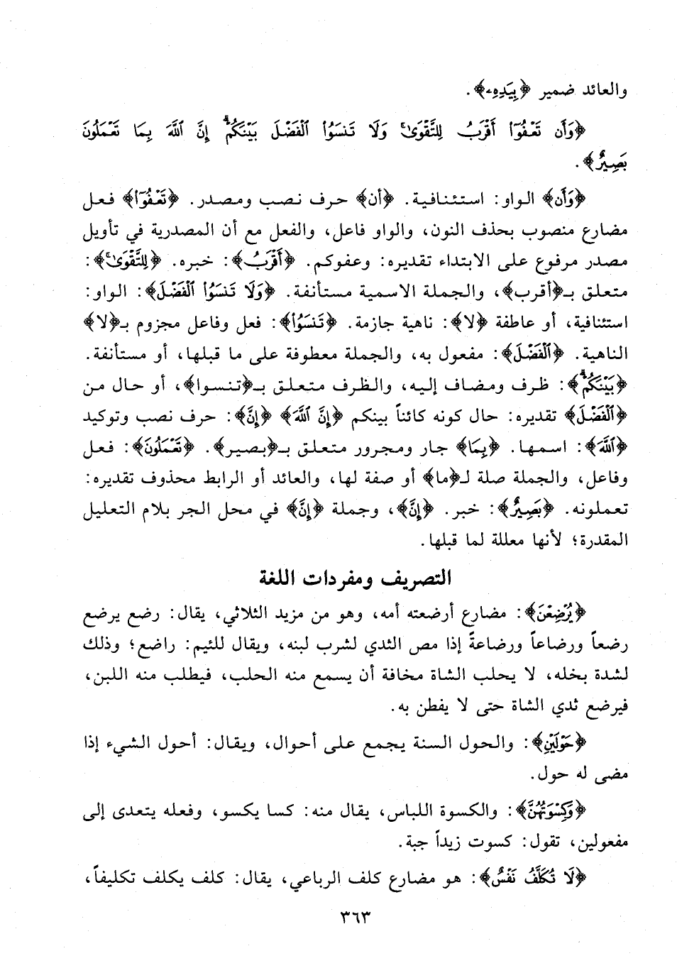 {وَأَنْ} الواو: استئنافية. {أن} حرف نصب ومصدر. {تَعْفُوا} فعل مضارع منصوب بحذف النون، والواو فاعل، والفعل مع أن المصدرية في تأويل مصدر مرفوع على الابتداء تقديره: وعفوكم. {أَقْرَبُ}: خبره. {لِلتَّقْوَى}: متعلق بـ {أقرب}، والجملة الإسمية مستأنفة. {وَلَا تَنْسَوُا الْفَضْلَ}: الواو: استئنافية، أو عاطفة {لا}: ناهية جازمة. {تَنْسَوُا}: فعل وفاعل مجزوم بـ {لا} الناهية. {الْفَضْلَ}: مفعول به، والجملة معطوفة على ما قبلها، أو مستأنفة. {بَيْنَكُمْ}: ظرف ومضاف إليه، والظرف متعلق بـ {تنسوا}، أو حال من {الْفَضْلَ} تقديره: حال كونه كائنًا بينكم {إِنَّ اللَّهَ} {إِنَّ}: حرف نصب وتوكيد {اللَّهَ}: اسمها. {بِمَا} جار ومجرور متعلق بـ {بصير}. {تَعْمَلُونَ}: فعل وفاعل، والجملة صلة لـ {ما} أو صفة لها، والعائد أو الرابط محذوف تقديره: تعملونه. {بَصِيرٌ}: خبر. {إِنَّ}، وجملة {إِنَّ} في محل الجر بلام التعليل المقدرة؛ لأنها معللة لما قبلها.