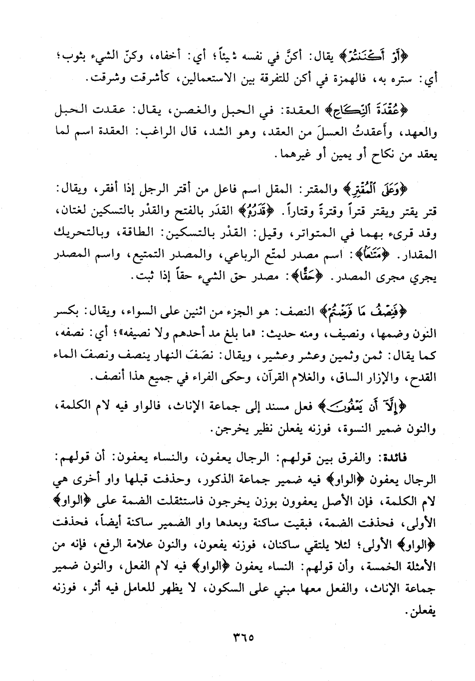 فائدة: والفرق بين قولهم: الرجال يعفون، والنساء يعفون: أن قولهم: الرجال يعفون {الواو} فيه ضمير جماعة الذكور، وحذفت قبلها واو أخرى هي لام الكلمة، فإن الأصل يعفوون بوزن يخرجون فاستثقلت الضمة على {الواو} الأولى، فحذفت الضمة، فبقيت ساكنة وبعدها واو الضمير ساكنة أيضًا، فحذفت {الواو} الأولى؛ لئلا يلتقي ساكنان، فوزنه يفعون، والنون علامة الرفع، فإنه من الأمثلة الخمسة، وأن قولهم: النساء يعفون {الواو} فيه لام الفعل، والنون ضمير جماعة الإناث، والفعل معها مبني على السكون، لا يظهر للعامل فيه أثر، فوزنه يفعلن.