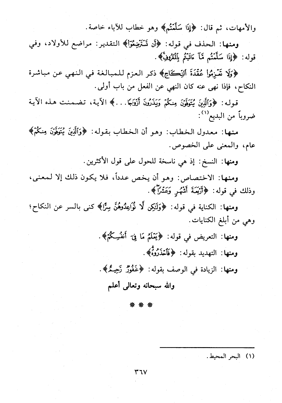 منها: معدول الخطاب: وهو أن الخطاب بقوله: {وَالَّذِينَ يُتَوَفَّوْنَ مِنْكُمْ} عام، والمعنى على الخصوص.
