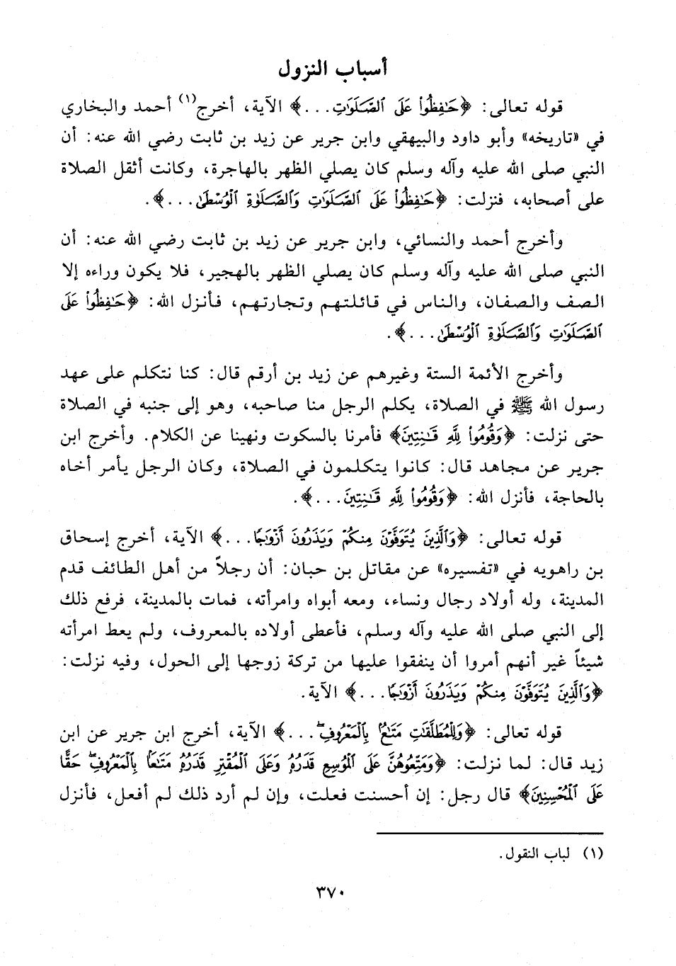 وأخرج الأئمة الستة وغيرهم عن زيد بن أرقم قال: كنا نتكلم على عهد رسول الله - صلى الله عليه وسلم - في الصلاة، يكلم الرجل منا صاحبه، وهو إلى جنبه في الصلاة حتى نزلت: {وَقُومُوا لِلَّهِ قَانِتِينَ} فأمرنا بالسكوت ونهينا عن الكلام. وأخرج ابن جرير عن مجاهد قال: كانوا يتكلمون في الصلاة، وكان الرجل يأمر أخاه بالحاجة، فأنزل الله: {وَقُومُوا لِلَّهِ قَانِتِينَ ...}.