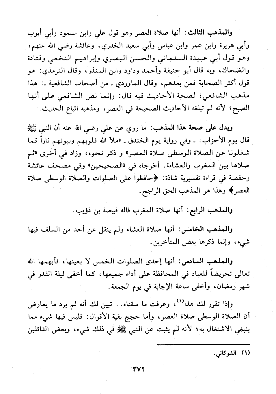 وإذا تقرر لك هذا (¬1)، وعرفت ما سقناه .. تبين لك أنه لم يرد ما يعارض أن الصلاة الوسطى صلاة العصر، وأما حجج بقية الأقوال: فليس فيها شيء مما ينبغي الاشتغال به؛ لأنه لم يثبت عن النبي - صلى الله عليه وسلم - في ذلك شيء، وبعض القائلين