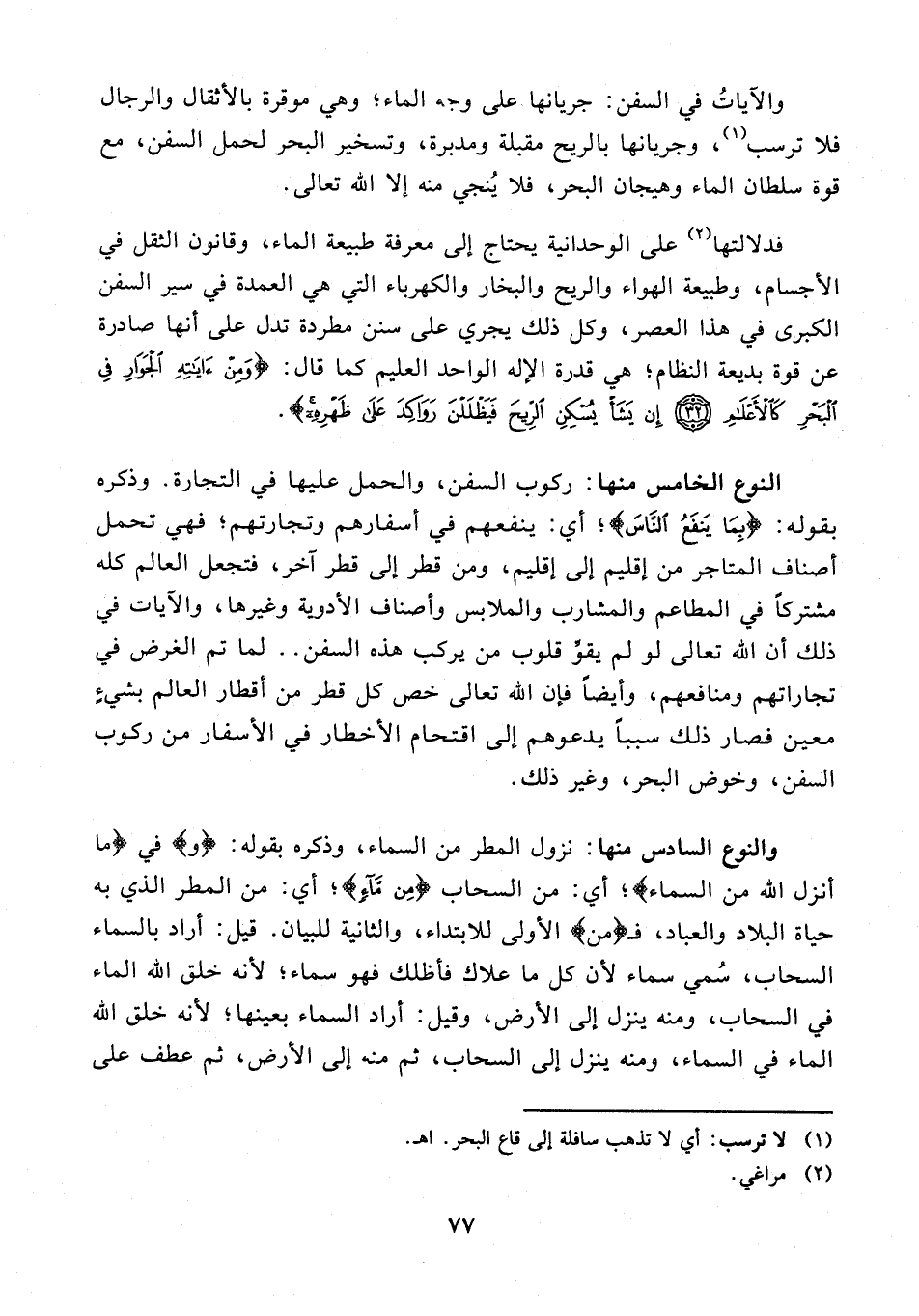 فدلالتها (¬2) على الوحدانية يحتاج إلى معرفة طبيعة الماء، وقانون الثقل في الأجسام، وطبيعة الهواء والريح والبخار والكهرباء التي هي العمدة في سير السفن الكبرى في هذا العصر، وكل ذلك يجري على سنن مطردة تدل على أنها صادرة عن قوة بديعة النظام؛ هي قدرة الإله الواحد العليم كما قال: {وَمِنْ آيَاتِهِ الْجَوَارِ في الْبَحْرِ كَالْأَعْلَامِ (32) إِنْ يَشَأْ يُسْكِنِ الرِّيحَ فَيَظْلَلْنَ رَوَاكِدَ عَلَى ظَهْرِهِ}.