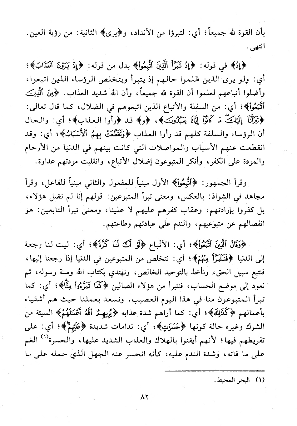 166 - {إِذْ} في قوله: {إِذْ تَبَرَّأَ الَّذِينَ اتُّبِعُوا} بدل من قوله: {إِذْ يَرَوْنَ الْعَذَابَ}؛ أي: ولو يرى الذين ظلموا حالهم إذ يتبرأ ويتخلص الرؤساء الذين اتبعوا، وأضلوا أتباعهم لعلموا أن القوة لله جميعًا، وأن الله شديد العذاب. {مِنَ الَّذِينَ اتَّبَعُوا}؛ أي: من السفلة والأتباع الذين اتبعوهم في الضلال، كما قال تعالى: {تَبَرَّأْنَا إِلَيْكَ مَا كَانُوا إِيَّانَا يَعْبُدُونَ}، {و} قد {رأوا العذاب}؛ أي: والحال أن الرؤساء والسفلة كلهم قد رأوا العذاب {وَتَقَطَّعَتْ بِهِمُ الْأَسْبَابُ}؛ أي: وقد انقطعت عنهم الأسباب والمواصلات التي كانت بينهم في الدنيا من الأرحام والمودة على الكفر، وأنكر المتبوعون إضلال الأتباع، وانقلبت مودتهم عداوة.