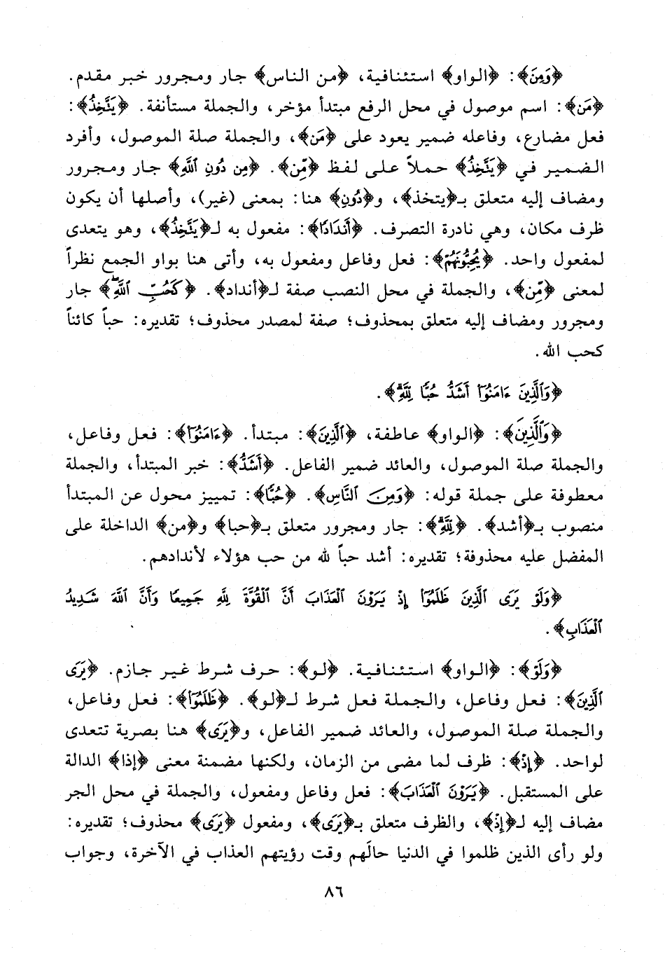 {وَالَّذِينَ}: {الواو} عاطفة، {الَّذِينَ}: مبتدأ. {آمَنُوا}: فعل وفاعل، والجملة صلة الموصول، والعائد ضمير الفاعل. {أَشَدُّ}: خبر المبتدأ، والجملة معطوفة على جملة قوله: {وَمِنَ النَّاسِ}. {حُبًّا}: تمييز محول عن المبتدأ منصوب بـ {أشد}. {لِلَّهِ}: جار ومجرور متعلق بـ {حبا} و {من} الداخلة على المفضل عليه محذوفة؛ تقديره: أشد حبًّا لله من حب هؤلاء لأندادهم.