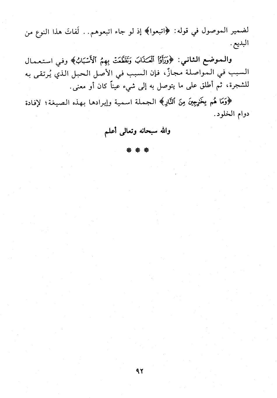والموضع الثاني: {وَرَأَوُا الْعَذَابَ وَتَقَطَّعَتْ بِهِمُ الْأَسْبَابُ} وفي استعمال السبب في المواصلة مجازٌ، فإن السبب في الأصل الحبل الذي يُرتقى به للشجرة، ثم أطلق على ما يتوصل به إلى شيء عينًا كان أو معنى.