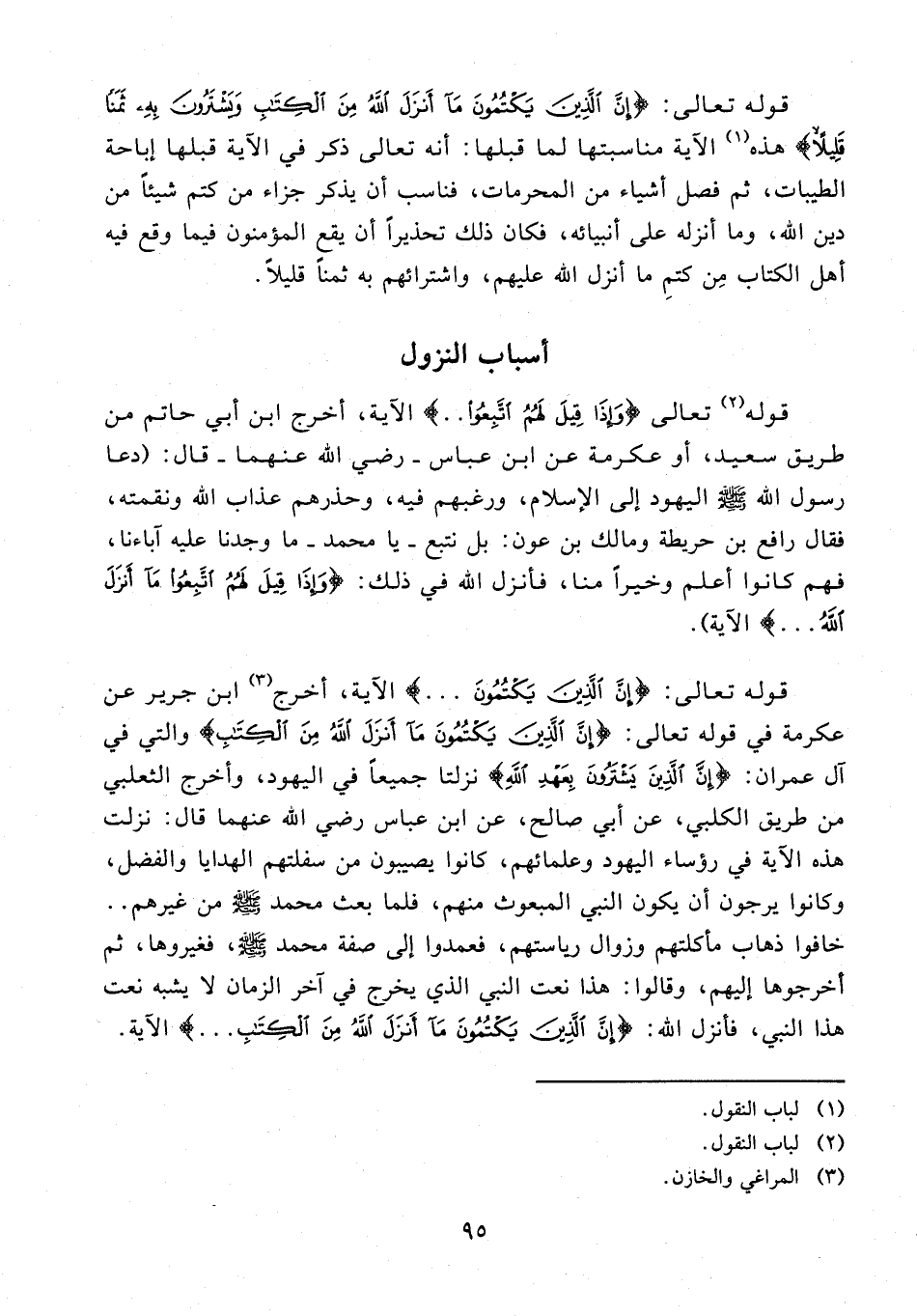 قوله تعالى: {إِنَّ الَّذِينَ يَكْتُمُونَ ...} الآية، أخرج (¬3) ابن جرير عن عكرمة في قوله تعالى: {إِنَّ الَّذِينَ يَكْتُمُونَ مَا أَنْزَلَ اللَّهُ مِنَ الْكِتَابِ} والتي في آل عمران: {إِنَّ الَّذِينَ يَشْتَرُونَ بِعَهْدِ اللَّهِ} نزلتا جميعًا في اليهود، وأخرج الثعلبي من طريق الكلبي، عن أبي صالح، عن ابن عباس رضي الله عنهما قال: نزلت هذه الآية في رؤساء اليهود وعلمائهم، كانوا يصيبون من سفلتهم الهدايا والفضل، وكانوا يرجون أن يكون النبي المبعوث منهم، فلما بعث محمد - صلى الله عليه وسلم - من غيرهم .. خافوا ذهاب مأكلتهم وزوال رياستهم، فعمدوا إلى صفة محمد - صلى الله عليه وسلم -، فغيروها، ثم أخرجوها إليهم، وقالوا: هذا نعت النبي الذي يخرج في آخر الزمان لا يشبه نعت هذا النبي، فأنزل الله: {إِنَّ الَّذِينَ يَكْتُمُونَ مَا أَنْزَلَ اللَّهُ مِنَ الْكِتَابِ ...} الآية.