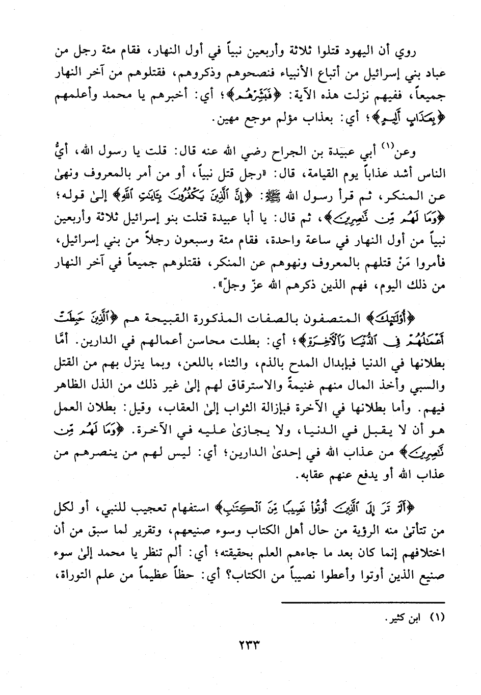 وعن (¬1) أبي عبيدة بن الجراح رضي الله عنه قال: قلت يا رسول الله، أيُّ الناس أشد عذابًا يوم القيامة، قال: "رجل قتل نبيًّا، أو من أمر بالمعروف ونهى عن المنكر، ثم قرأ رسول الله - صلى الله عليه وسلم -: {إِنَّ الَّذِينَ يَكْفُرُونَ بِآيَاتِ اللَّهِ} إلى قوله: {وَمَا لَهُمْ مِنْ نَاصِرِينَ}، ثم قال: يا أبا عبيدة قتلت بنو إسرائيل ثلاثة وأربعين نبيًّا من أول النهار في ساعة واحدة، فقام مئة وسبعون رجلًا من بني إسرائيل، فأمروا مَنْ قتلهم بالمعروف ونهوهم عن المنكر، فقتلوهم جميعًا في آخر النهار من ذلك اليوم، فهم الذين ذكرهم الله عَزَّ وَجَلَّ".