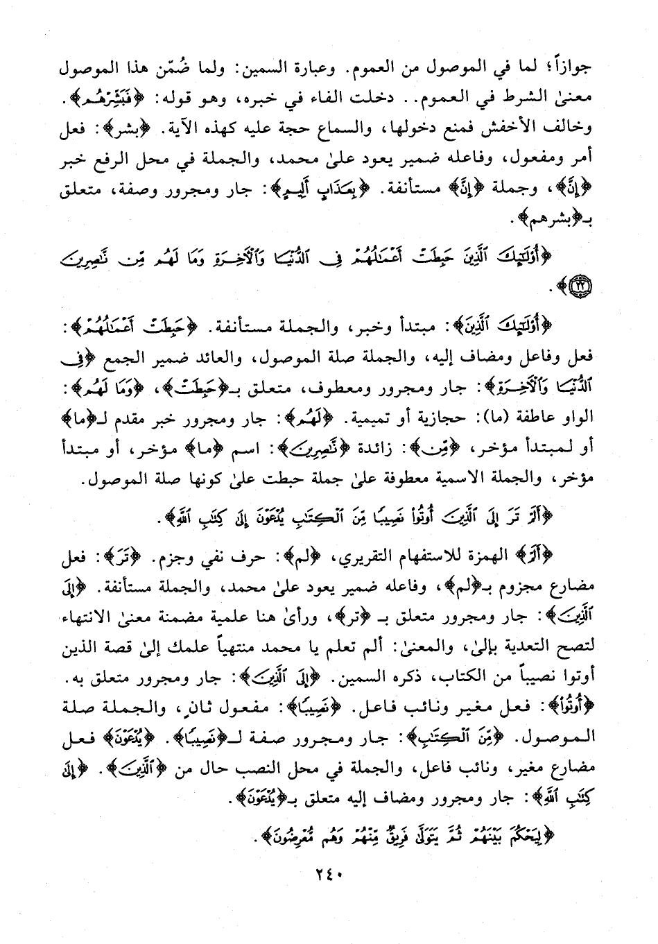 {أَلَمْ} الهمزة للاستفهام التقريري، {لم}: حرف نفي وجزم. {تَرَ}: فعل مضارع مجزوم بـ {لم}، وفاعله ضمير يعود على محمَّد، والجملة مستأنفة. {إِلَى الَّذِينَ}: جار ومجرور متعلق بـ {تر}، ورأى هنا علمية مضمنة معنى الانتهاء لتصح التعدية بإلى، والمعنى: ألم تعلم يا محمَّد منتهيًا علمك إلى قصة الذين أوتوا نصيبًا من الكتاب، ذكره السمين. {إِلَى الَّذِينَ}: جار ومجرور متعلق به. {أُوتُوا}: فعل مغير ونائب فاعل. {نَصِيبًا}: مفعول ثانٍ، والجملة صلة الموصول. {مِنَ الْكِتَابِ}: جار ومجرور صفة لـ {نَصِيبًا}. {يُدْعَوْنَ} فعل مضارع مغير، ونائب فاعل، والجملة في محل النصب حال من {الَّذِينَ}. {إِلَى كِتَابِ اللَّهِ}: جار ومجرور ومضاف إليه متعلق بـ {يُدْعَوْنَ}.