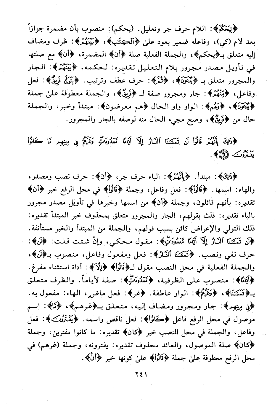 {لِيَحْكُمَ}: اللام حرف جر وتعليل. (يحكم): منصوب بأن مضمرة جوازًا بعد لام (كي)، وفاعله ضمير يعود على {الْكِتَابِ}، {بَيْنَهُمْ}: ظرف ومضاف إليه متعلق بـ {يحكم}، والجملة الفعلية صلة {أن} المضمرة، {أن} مع صلتها في تأويل مصدر مجرور بلام التعليل تقديره: لحكمه، {بَيْنَهُمْ}: الجار والمجرور متعلق بـ {يُدْعَوْنَ}، {ثُمَّ}: حرف عطف وترتيب. {يَتَوَلَّى فَرِيقٌ}: فعل وفاعل، {مِنْهُمْ}: جار ومجرور صفة لـ {فَرِيقٌ}، والجملة معطوفة على جملة {يُدْعَوْنَ}، {وَهُم}: الواو واو الحال {هم معرضون}: مبتدأ وخبر، والجملة حال من {فَرِيقٌ}، وصح مجيء الحال منه لوصفه بالجار والمجرور.