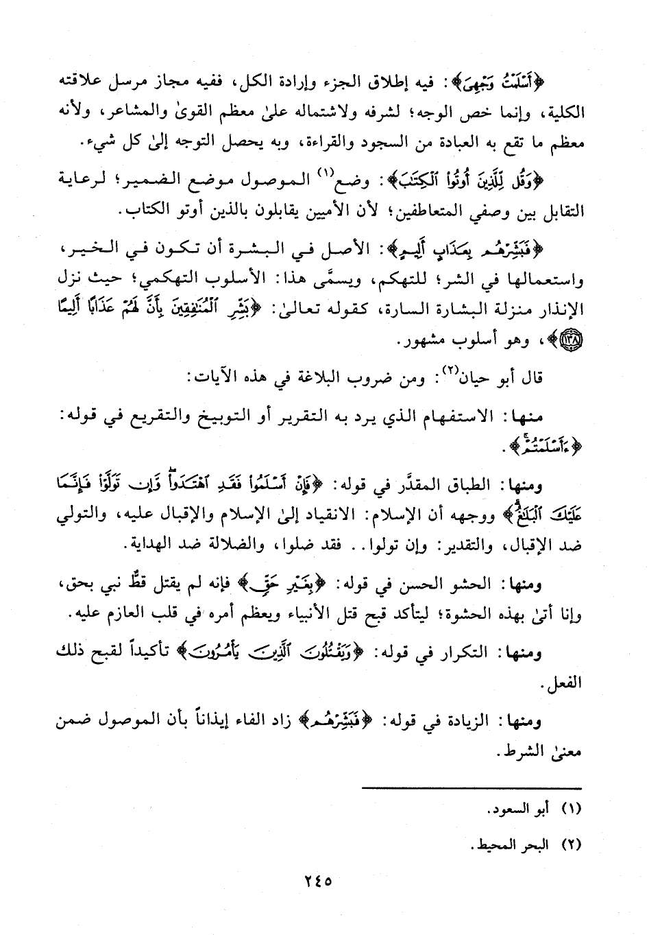 ومنها: الطباق المقدَّر في قوله: {فَإِنْ أَسْلَمُوا فَقَدِ اهْتَدَوْا وَإِنْ تَوَلَّوْا فَإِنَّمَا عَلَيْكَ الْبَلَاغُ} ووجهه أن الإِسلام: الانقياد إلى الإِسلام والإقبال عليه، والتولي ضد الإقبال، والتقدير: وإن تولوا .. فقد ضلوا، والضلالة ضد الهداية.