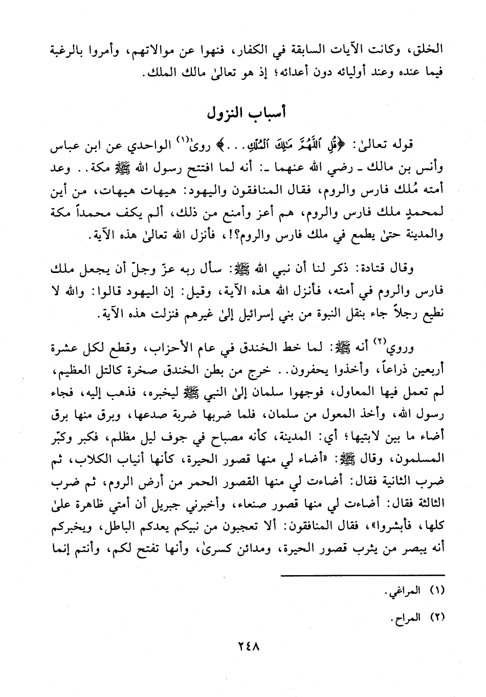 26 - قوله تعالى: {قُلِ اللَّهُمَّ مَالِكَ الْمُلْكِ ...} روى (¬1) الواحد عن ابن عباس وأنس بن مالك - رضي الله عنهما -: أنه لما افتتح رسول الله - صلى الله عليه وسلم - مكة .. وعد أمته مُلك فارس والروم، فقال المنافقون واليهود: هيهات هيهات، من أين لمحمدٍ ملك فارس والروم، هم أعز وأمنع من ذلك، ألم يكف محمدًا مكة والمدينة حتى يطمع في ملك فارس والروم؟!، فأنزل الله تعالى هذه الآية.