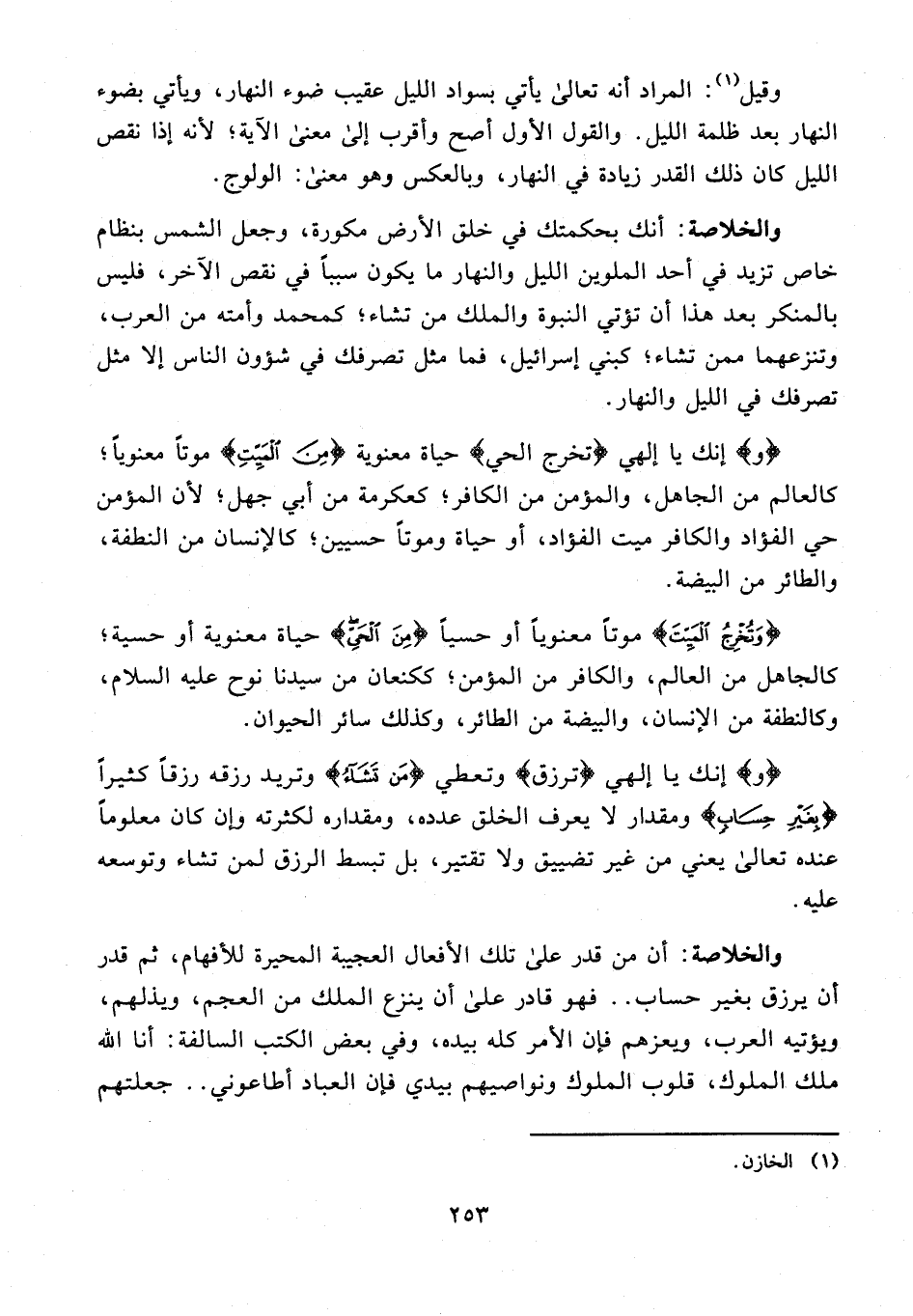 والخلاصة: أنك بحكمتك في خلق الأرض مكورة، وجعل الشمس بنظام خاص تزيد في أحد الملوين الليل والنهار ما يكون سببًا في نقص الآخر، فليس بالمنكر بعد هذا أن تؤتي النبوة والملك من تشاء؛ كمحمد وأمته من العرب، وتنزعهما ممن تشاء؛ كبني إسرائيل، فما مثل تصرفك في شؤون الناس إلا مثل تصرفك في الليل والنهار.