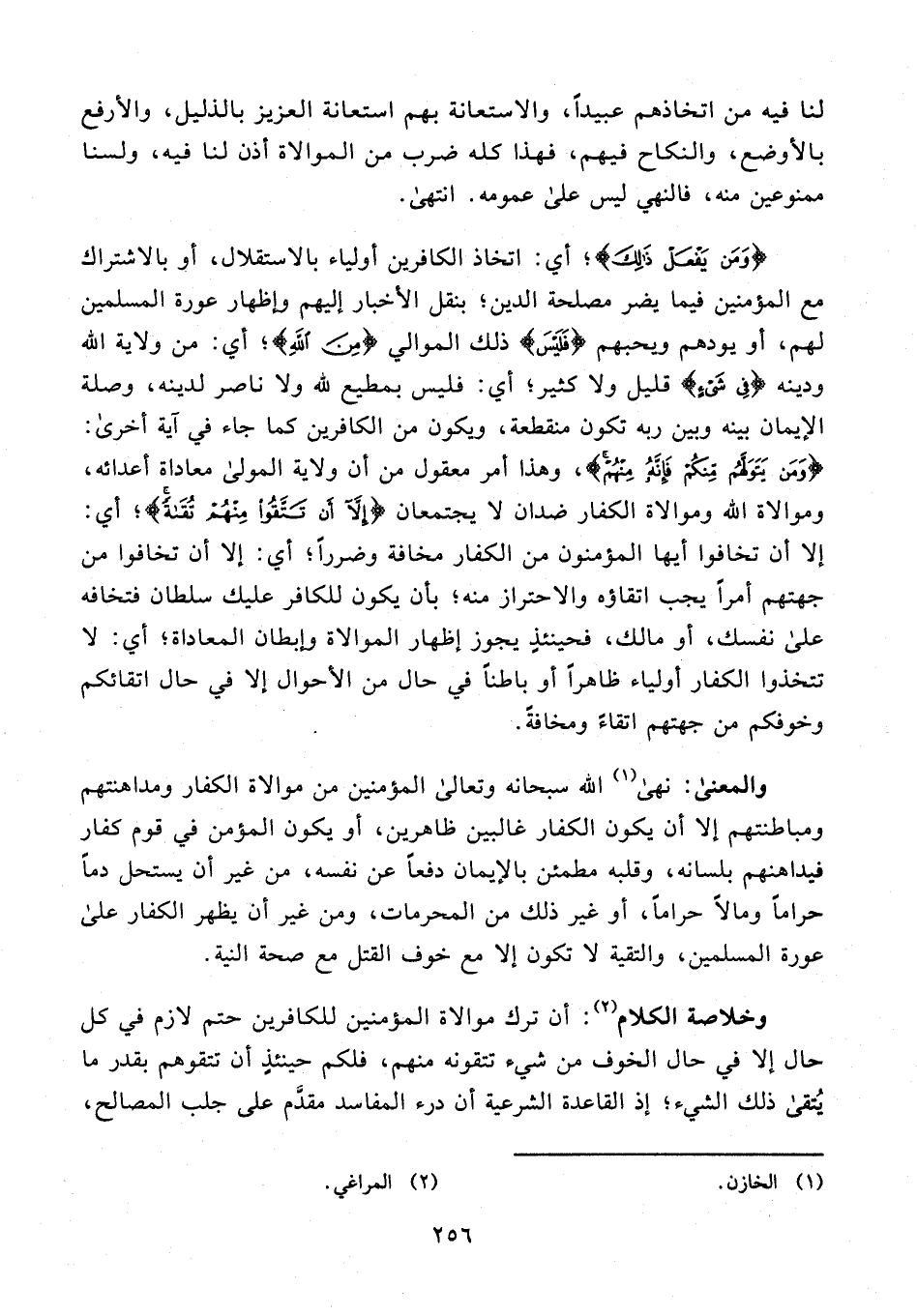 وخلاصة الكلام (¬2): أن ترك موالاة المؤمنين للكافرين حتم لازم في كل حال إلا في حال الخوف من شي تتقونه منهم، فلكم حينئذٍ أن تتقوهم بقدر ما يُتقى ذلك الشيء؛ إذ القاعدة الشرعية أن درء المفاسد مقدَّم على جلب المصالح،