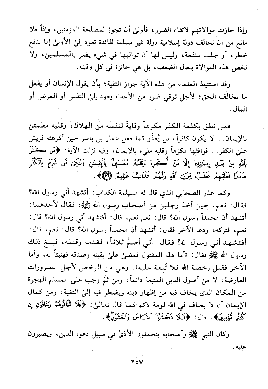 وكما عذر الصحابي الذي قال له مسيلمة الكذاب: أتشهد أني رسول الله؟ فقال: نعم، حين أخذ رجلين من أصحاب رسول الله - صلى الله عليه وسلم -، فقال لأحدهما: أتشهد أن محمدًا رسول الله؟ قال: نعم نعم، قال: أفتشهد أني رسول الله؟ قال: نعم، فتركه، ودعا الآخر فقال: أتشهد أن محمدًا رسول الله؟ قال: نعم، قال: أفتشهد أني رسول الله؟ فقال: إني أصمُّ ثلاثًا، فقدمه وقتله، فبلغ ذلك رسول الله - صلى الله عليه وسلم - فقال: "أما هذا المقتول فمضى على يقينه وصدقه فهنيئًا له، وأما الآخر فقبل رخصة الله فلا تَبِعة عليه". وهي من الرخص لأجل الضرورات العارضة، لا من أصول الدين المتبعة دائمًا، ومن ثمَّ وجب على المسلم الهجرة من المكان الذي يخاف فيه من إظهار دينه ويضطر فيه إلى التقية، ومن كمال الإيمان أن لا يخاف في الله لومة لائم كما قال تعالى: {فَلَا تَخَافُوهُمْ وَخَافُونِ إِنْ كُنْتُمْ مُؤْمِنِينَ}، قال: {فَلَا تَخْشَوُا النَّاسَ وَاخْشَوْنِ}.