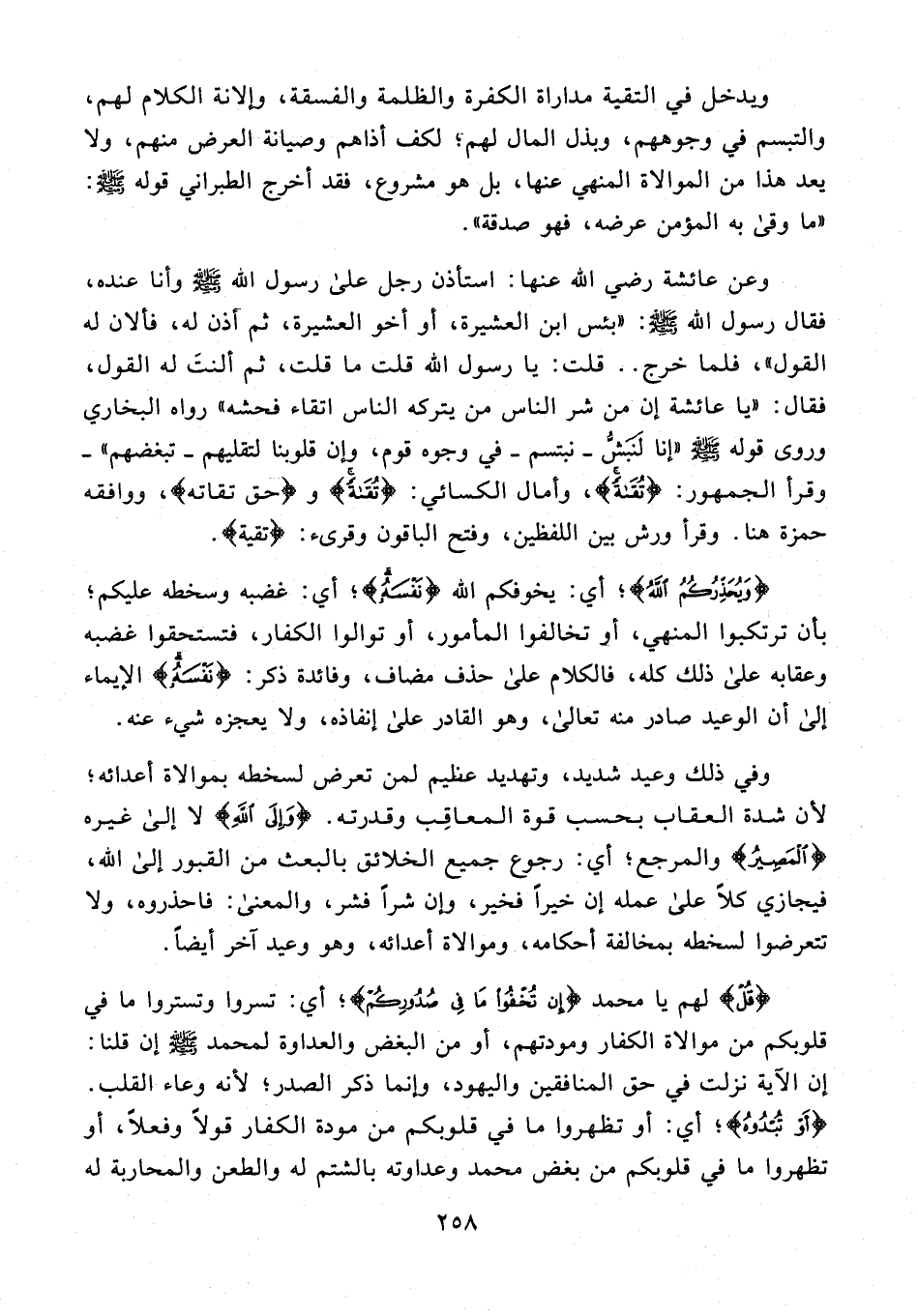 وعن عائشة رضي الله عنها: استأذن رجل على رسول الله - صلى الله عليه وسلم - وأنا عنده، فقال رسول الله - صلى الله عليه وسلم -: "بئس ابن العشيرة، أو أخو العشيرة، ثم أذن له، فألان له القول"، فلما خرج .. قلت: يا رسول الله قلت ما قلت، ثم ألنتَ له القول، فقال: "يا عائشة إن من شر الناس من يتركه الناس اتقاء فحشه" رواه البخاري وروى قوله - صلى الله عليه وسلم - "إنا لنبَشُّ - نبتسم - في وجوه قوم، وإن قلوبنا لتقليهم - تبغضهم" - وقرأ الجمهور: {تُقَاةً}، وأمال الكسائي: {تُقَاةً} و {حق تقاته}، ووافقه حمزة هنا. وقرأ ورش بين اللفظين، وفتح الباقون وقرىء: {تقية}.