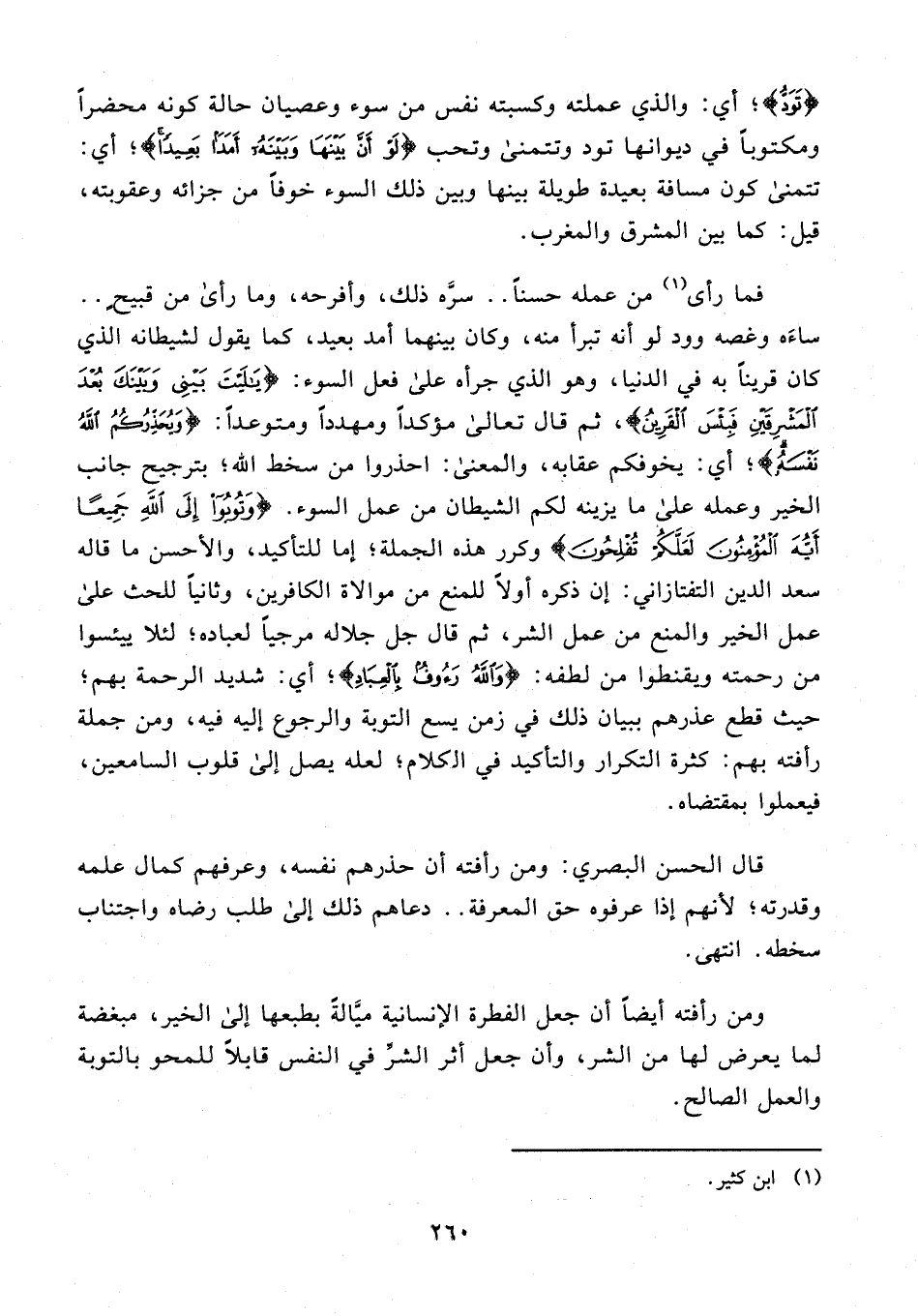 فما رأى (¬1) من عمله حسنًا .. سرَّه ذلك، وأفرحه، وما رأى من قبيحٍ .. ساءَه وغصه وود لو أنه تبرأ منه، وكان بينهما أمد بعيد، كما يقول لشيطانه الذي كان قرينًا به في الدنيا، وهو الذي جرأه على فعل السوء: {يَا لَيْتَ بَيْنِي وَبَيْنَكَ بُعْدَ الْمَشْرِقَيْنِ فَبِئْسَ الْقَرِينُ}، ثم قال تعالى مؤكدًا ومهددًا ومتوعدًا: {وَيُحَذِّرُكُمُ اللَّهُ نَفْسَهُ}؛ أي: يخوفكم عقابه، والعني: احذروا من سخط الله؛ بترجيح جانب الخير وعمله على ما يزينه لكم الشيطان من عمل السوء. {وَتُوبُوا إِلَى اللَّهِ جَمِيعًا أَيُّهَ الْمُؤْمِنُونَ لَعَلَّكُمْ تُفْلِحُونَ} وكرر هذه الجملة؛ إما للتأكيد، والأحسن ما قاله سعد الدين التفتازاني: إن ذكره أولًا للمنع من موالاة الكافرين، وثانيًا للحث على عمل الخير والمنع من عمل الشر، ثم قال جل جلاله مرجيًا لعباده؛ لئلا ييئسوا من رحمته ويقنطوا من لطفه: {وَاللَّهُ رَءُوفٌ بِالْعِبَادِ}؛ أي: شديد الرحمة بهم؛ حيث قطع عذرهم ببيان ذلك في زمن يسع التوبة والرجوع إليه فيه، ومن جملة رأفته بهم: كثرة التكرار والتأكيد في الكلام؛ لعله يصل إلى قلوب السامعين، فيعملوا بمقتضاه.