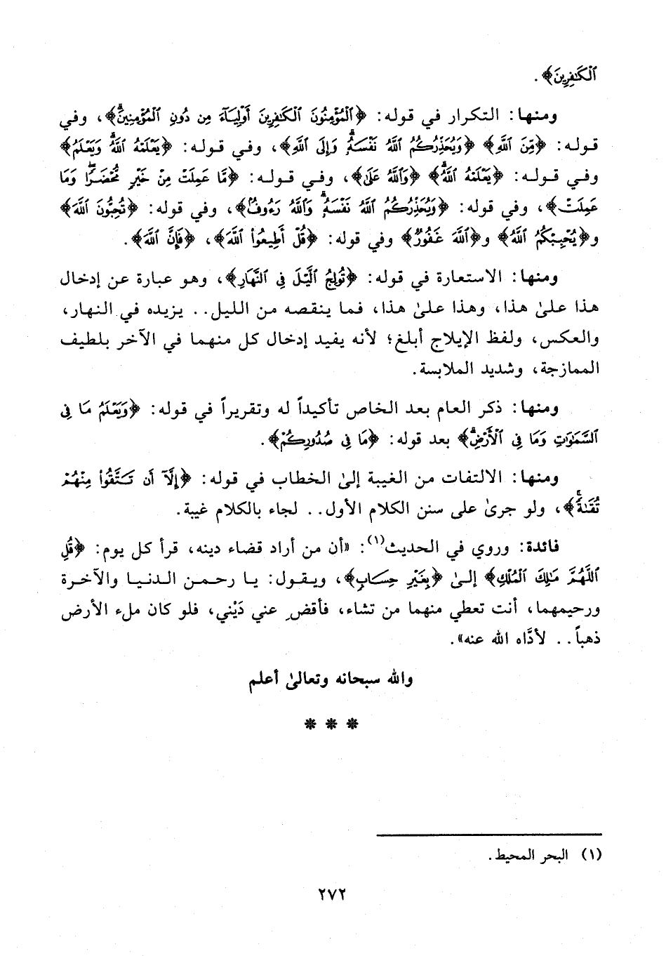 ومنها: التكرار في قوله: {الْمُؤْمِنُونَ الْكَافِرِينَ أَوْلِيَاءَ مِنْ دُونِ الْمُؤْمِنِينَ}، وفي قوله: {مِنَ اللَّهِ} {وَيُحَذِّرُكُمُ اللَّهُ نَفْسَهُ وَإِلَى اللَّهِ}، وفي قوله: {يَعْلَمْهُ اللَّهُ وَيَعْلَمُ} وفي قوله: {يَعْلَمْهُ اللَّهُ} {وَاللَّهُ عَلَى}، وفي قوله: {مَا عَمِلَتْ مِنْ خَيْرٍ مُحْضَرًا وَمَا عَمِلَتْ}، وفي قوله: {وَيُحَذِّرُكُمُ اللَّهُ نَفْسَهُ وَاللَّهُ رَءُوفٌ}، وفي قوله: {تُحِبُّونَ اللَّهَ} و {يُحْبِبْكُمُ اللَّهُ} و {وَاللَّهُ غَفُورٌ} وفي قوله: {قُلْ أَطِيعُوا اللَّهَ}، {فَإِنَّ اللَّهَ}.