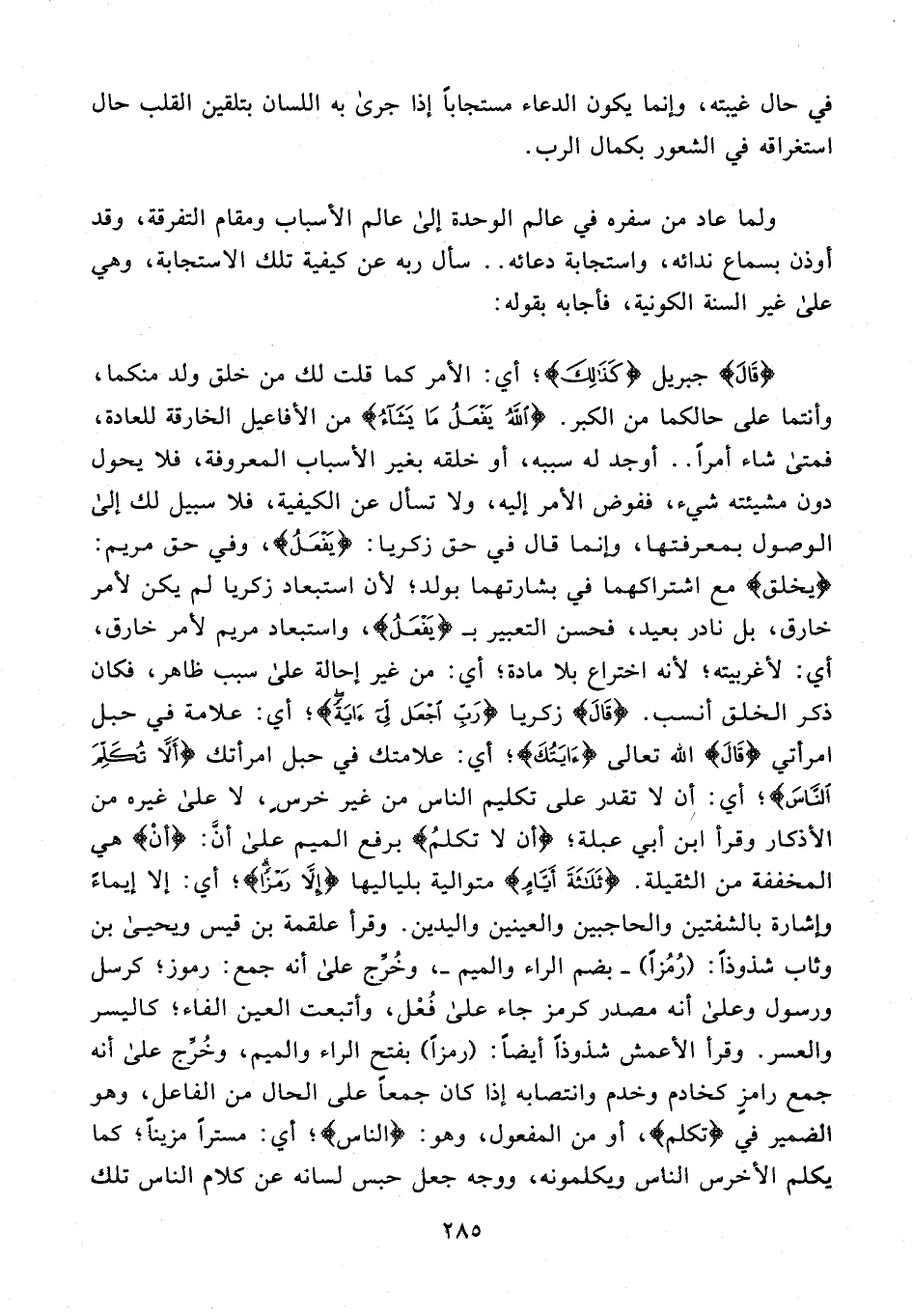 41 - {قَالَ} زكريا {رَبِّ اجْعَلْ لِي آيَةً}؛ أي: علامة في حبل امرأتي {قَالَ} الله تعالى {ءَايَتُكَ}؛ أي: علامتك في حبل امرأتك {أَلَّا تُكَلِّمَ النَّاسَ}؛ أي: أن لا تقدر على تكليم الناس من غير خرسٍ، لا على غيره من الأذكار وقرأ ابن أبي عبلة؛ {أن} لا تكلمُ برفع الميم على أنَّ: {أن} هي المخففة من الثقيلة. {ثَلَاثَةَ أَيَّامٍ} متوالية بلياليها {إِلَّا رَمْزًا}؛ أي؛ إلا إيماءً وإشارة بالشفتين والحاجبين والعينين واليدين. وقرأ علقمة بن قيس ويحيى بن وثاب شذوذًا: (رُمُزًا) - بضم الراء واليم -، وخُرِّج على أنه جمع: رموز؛ كرسل ورسول وعلى أنه مصدر كرمز جاء على فُعْل، وأتبعت العين الفاء؛ كاليسر والعسر. وقرأ الأعمش شذوذًا أيضًا: (رمزًا) بفتح الراء واليم، وخُرِّج على أنه جمع رامزٍ كخادم وخدم وانتصابه إذا كان جمعًا على الحال من الفاعل، وهو الضمير في {تكلم}، أو من المفعول، وهو: {الناس}؛ أي: مسترًا مزينًا؛ كما يكلم الأخرس الناس ويكلمونه، ووجه جعل حبس لسانه عن كلام الناس تلك