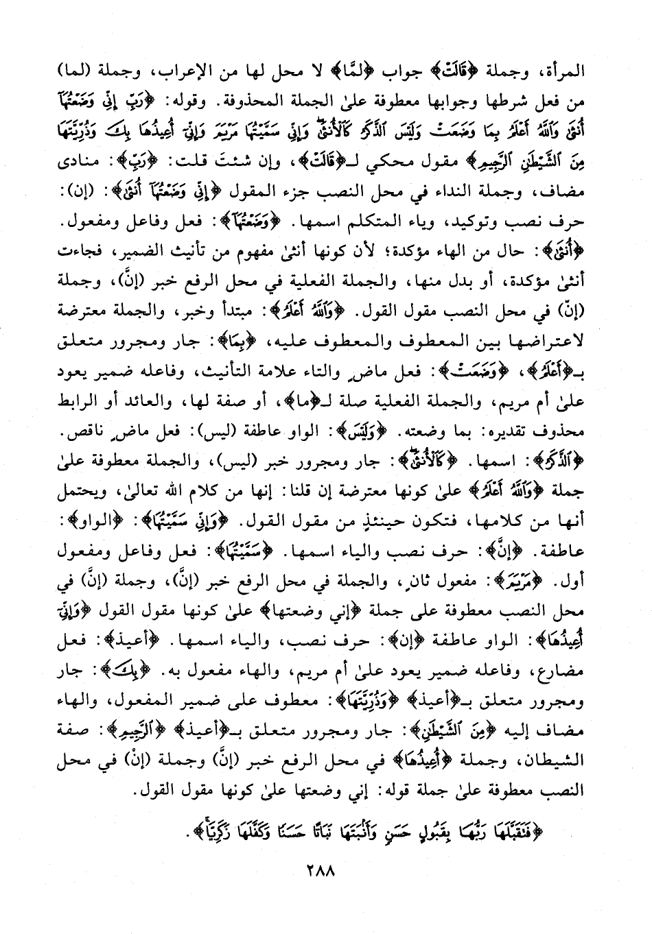 المرأة، وجملة {قَالَتْ} جواب {لَمَّا} لا محل لها من الإعراب، وجملة (لما) من فعل شرطها وجوابها معطوفة على الجملة المحذوفة. وقوله: {رَبِّ إِنِّي وَضَعْتُهَا أُنْثَى وَاللَّهُ أَعْلَمُ بِمَا وَضَعَتْ وَلَيْسَ الذَّكَرُ كَالْأُنْثَى وَإِنِّي سَمَّيْتُهَا مَرْيَمَ وَإِنِّي أُعِيذُهَا بِكَ وَذُرِّيَّتَهَا مِنَ الشَّيْطَانِ الرَّجِيمِ} مقول محكي لـ {قَالَتْ}، وإن شئتَ قلت: {رَبِّ}: منادى مضاف، وجملة النداء في محل النصب جزء المقول {إنِّي وَضَعْتُهَا أُنْثَى}: {إن}: حرف نصب وتوكيد، وياء المتكلم اسمها. {وَضَعَتْهَا}: فعل وفاعل ومفعول. {أُنْثَى}: حال من الهاء مؤكدة؛ لأن كونها أنثى مفهوم من تأنيث الضمير، فجاءت أنثى مؤكدة، أو بدل منها، والجملة الفعلية في محل الرفع خبر {إنَّ}، وجملة (إنّ) في محل النصب مقول القول. {وَاللَّهُ أَعْلَمُ}: مبتدأ وخبر، والجملة معترضة لاعتراضها بين المعطوف والمعطوف عليه، {بِمَا}: جار ومجرور متعلق بـ {أَعْلَمُ}: {وَضَعَتْ} فعل ماضٍ والتاء علامة التأنيث، وفاعله ضمير يعود على أم مريم، والجملة الفعلية صلة لـ {ما}، أو صفة لها، والعائد أو الرابط محذوف تقديره: بما وضعته. {وَلَيْسَ}: الواو عاطفة (ليس): فعل ماضٍ ناقص. {الذَّكَرُ}: اسمها. {كَالْأُنْثَى}: جار ومجرور خبر (ليس)، والجملة معطوفة على جملة {وَاللَّهُ أَعْلَمُ} على كونها معترضة إن قلنا: إنها من كلام الله تعالى، ويحتمل أنها من كلامها، فتكون حينئذٍ من مقول القول. {وَإِنِّي سَمَّيْتُهَا}: {الواو}: عاطفة. {إنَّ}: حر نصب والياء اسمها. {سَمَّيْتُهَا}: فعل وفاعل ومفعول أول. {مَرْيَمَ}: مفعول ثانٍ، والجملة في محل الرفع خبر {إنَّ}، وجملة {إنَّ} في محل النصب معطوفة على جملة {إني وضعتها} على كونها مقول القول {وَإِنِّي أُعِيذُهَا}: الواو عاطفة {إن}: حرف نصب، والياء اسمها. {أعيذ}: فعل مضارع، وفاعله ضمير يعود على أم مريم، والهاء مفعول به. {بِكَ}: جار ومجرور متعلق بـ {أعيذ} {وَذُريتَهَا}: معطوف على ضمير المفعول، والهاء مضاف إليه {مِنَ الشَّيْطَانِ}: جار ومجرور متعلق بـ {أعيذ} {الرَّجِيمِ}: صفة الشيطان، وجملة {أُعَيذُهَا} في محل الرفع خبر {إنَّ} وجملة {إن} في محل النصب معطوفة على جملة قوله: إني وضعتها على كونها مقول القول.