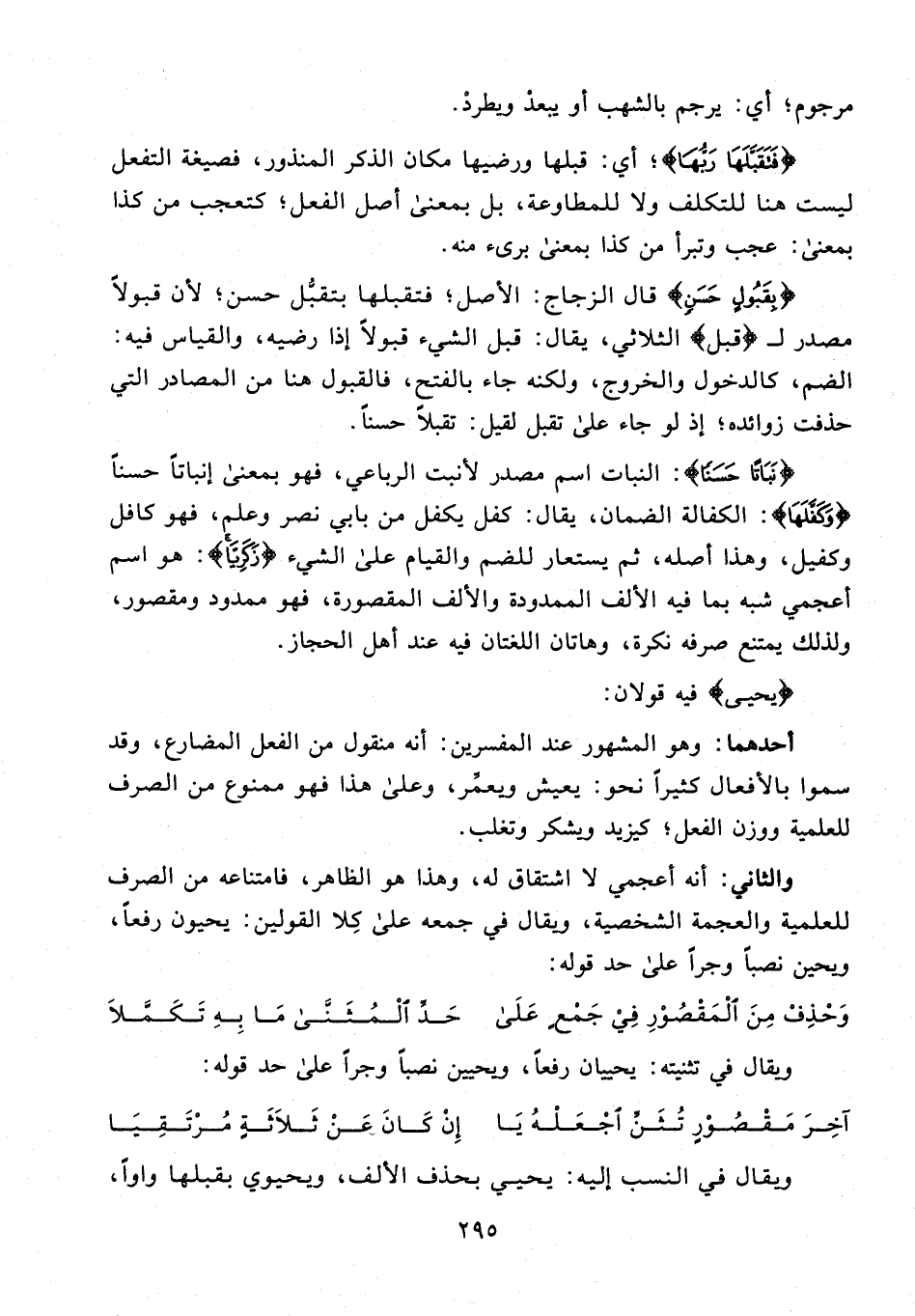 {نَبَاتًا حَسَنًا}: النبات اسم مصدر لأنبت الرباعي، فهو بمعنى إنباتًا حسنًا {وَكَفَّلَهَا}: الكفالة الضمان، يقال: كفل يكفل من بابي نصر وعلم، فهو كافل وكفيل، وهذا أصله، ثم يستعار للضم والقيام على الشيء {زَكَرِيَّا}: هو اسم أعجمي شبه بما فيه الألف الممدودة والألف المقصورة، فهو ممدود ومقصور، ولذلك يمتنع صرفه نكرة، وهاتان اللغتان فيه عند أهل الحجاز.